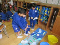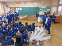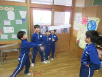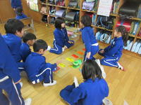 2年生は生活科の学習で身の回りの材料を使ったおもちゃ作りをしました。作ったものを1年生に楽しんでもらおうと、ルール説明からゲームの楽しみ方まで考え、今日は楽しみにしていた1年生を迎えて、おもちゃまつりを開きました。1年生を前に緊張の面持ちの2年生とわくわくしている1年生の表情が対照的でしたが、ゲームが始まるとお互いに笑顔で楽しむ様子が見られました。今回をきっかけにして、1・2年生の日常的な交流が深まることを願っています。