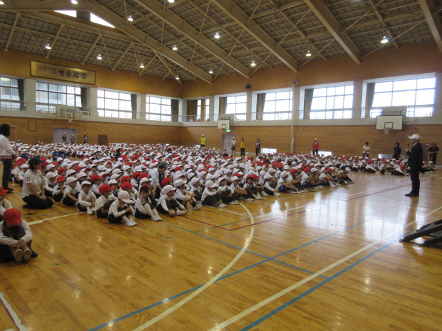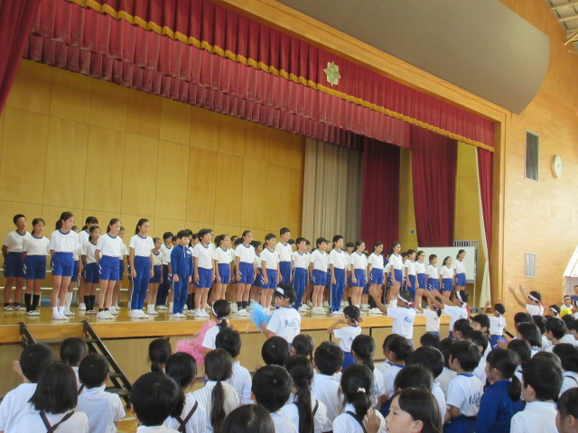 壮行会は、集会委員会が中心となって行います。9月30日に行われる「福島県マーチングフェスティバル」に出場するマーチングクラブ、10月2日に行われる「福島市小学校陸上競技大会」に出場する代表児童にエールを送りました。