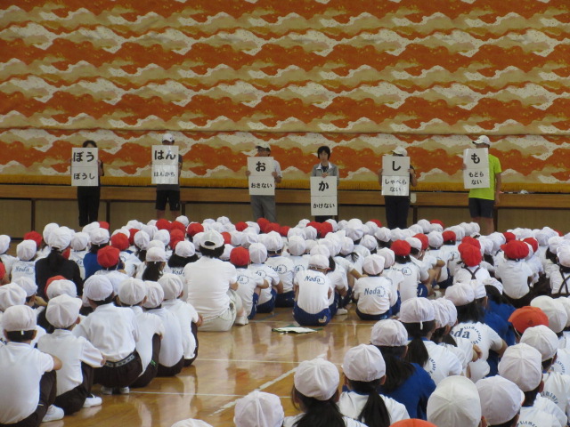 避難の際の合言葉「ぼう・はん・お・か・し・も」を皆で確認しました。この言葉の意味はお子さんにお聞きください。