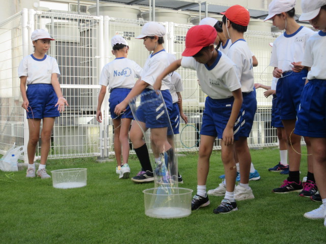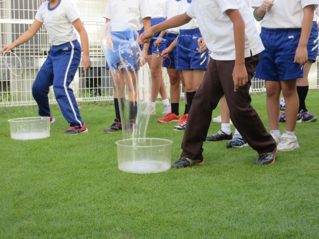 科学クラブの活動は中庭で行いました。「巨大シャボン玉を作ろう」と手製の道具でシャボン玉作りを楽しみました。