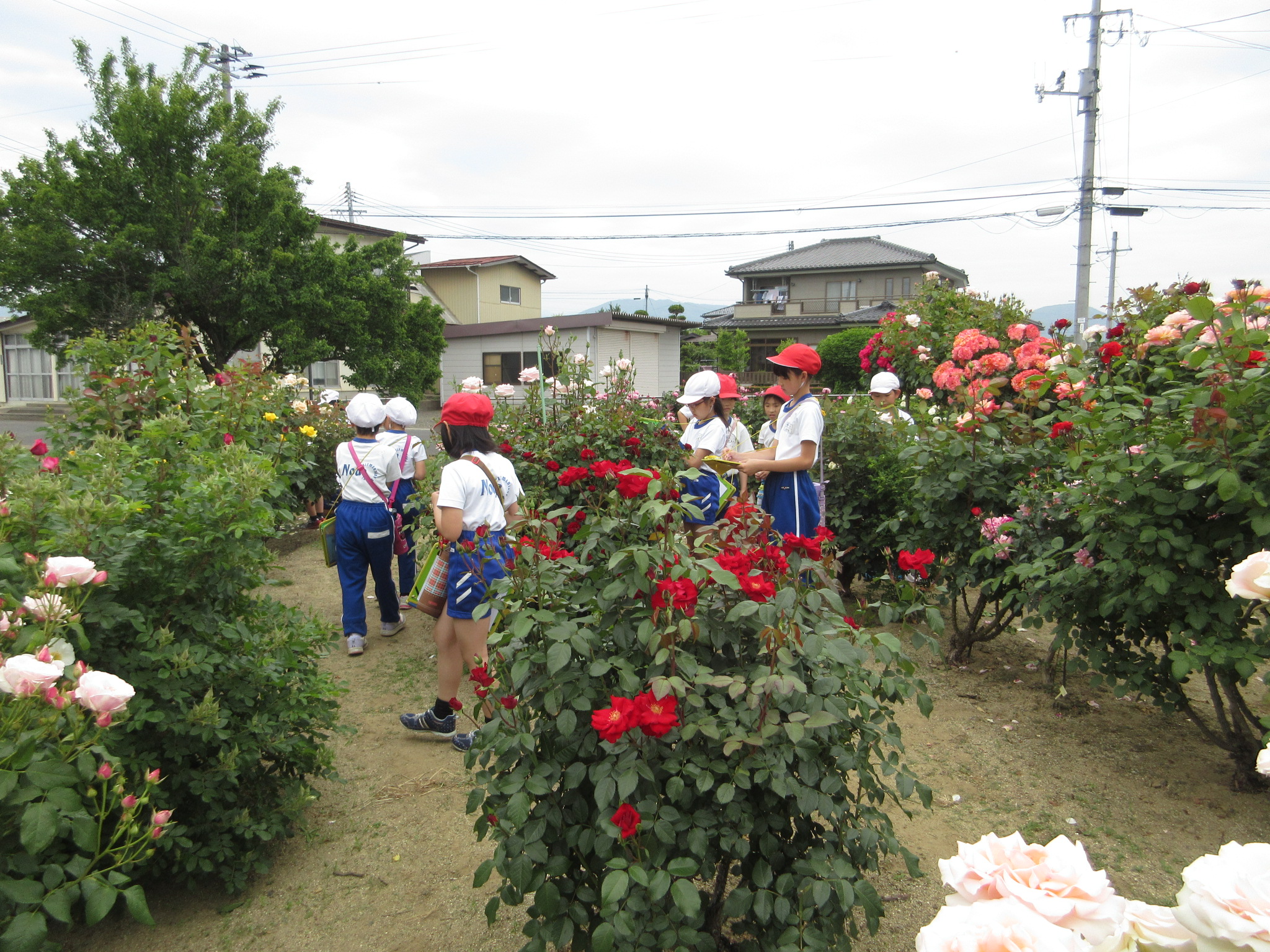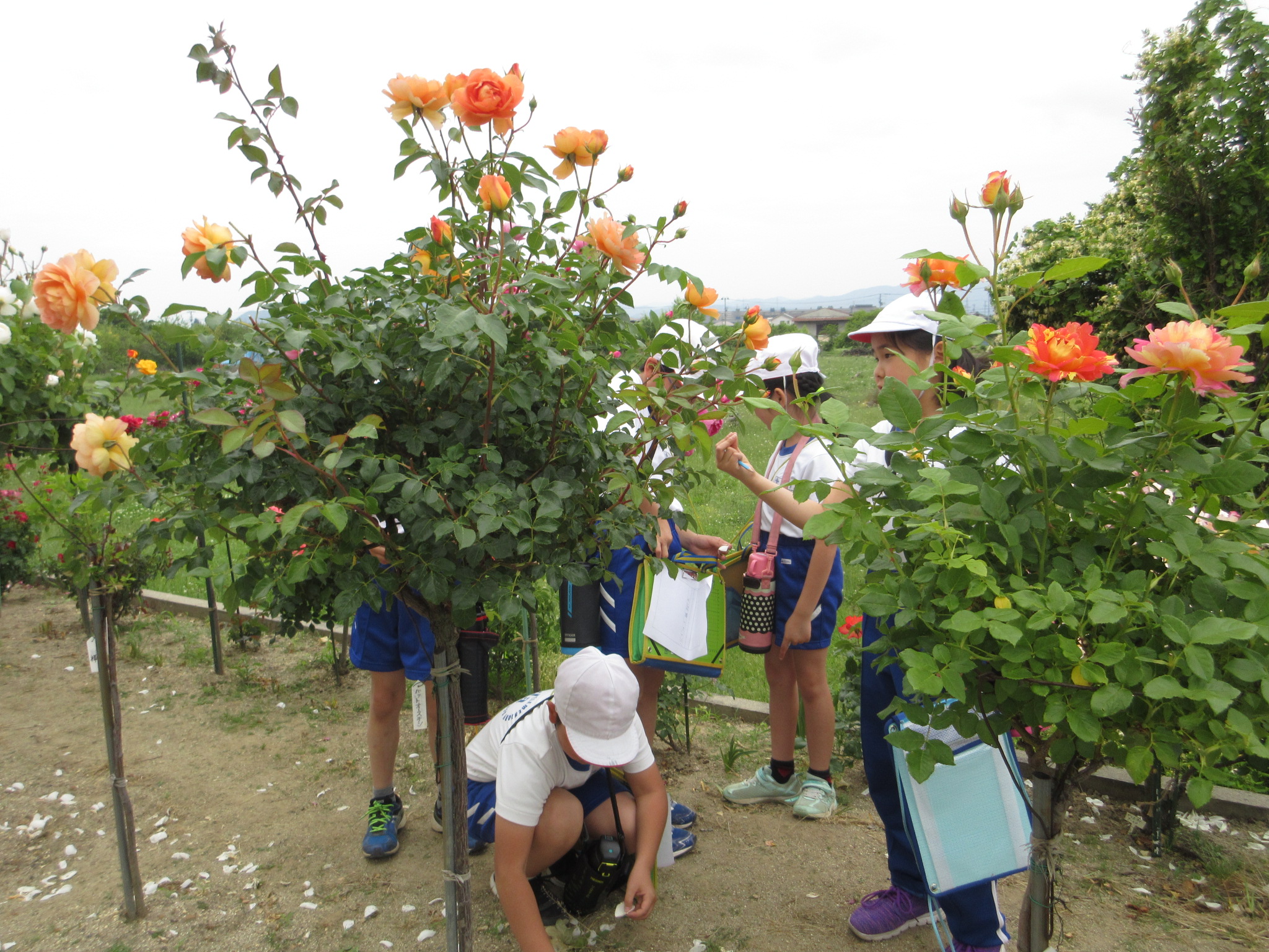 ◇5月30日、4年生は校外学習を行いました。総合的な学習の時間の「野田の素敵な町づくり」の学習で、地域の方が育てているバラ園を見学しました。地域の方みんなが気持ちよくなる素敵な場所を提供してくださっていることが分かりました。