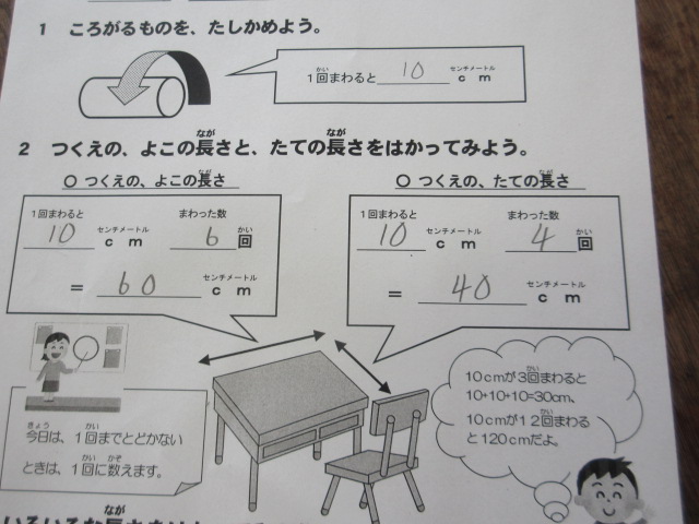 10cmの「コロコロ」を使って長さを測る活動では、教室の中にあるさまざまなものの長さを楽しく測ることができました。