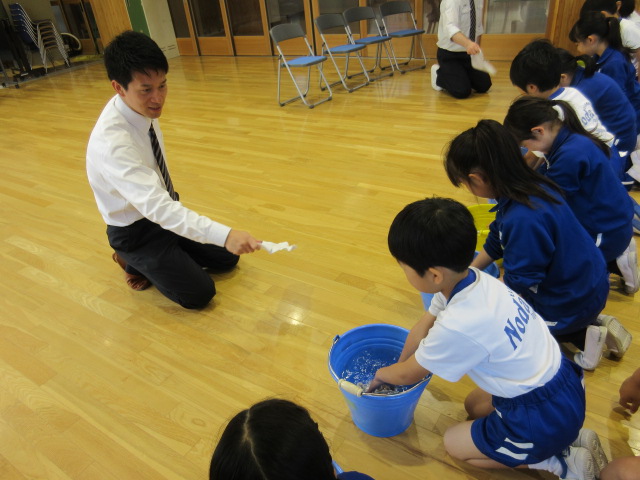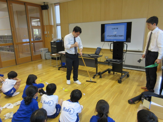 クラスごとに、掃除の意義を分かりやすく教えていただきました。ほうきやちりとり、ぞうきんの使い方を実践を交えながら学習しました。