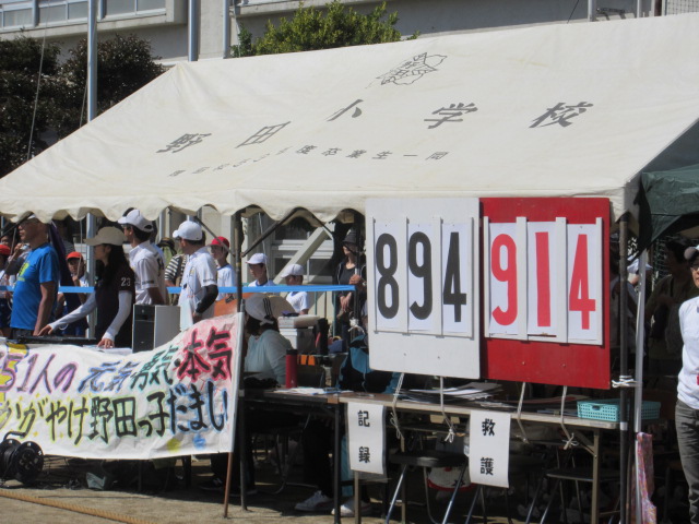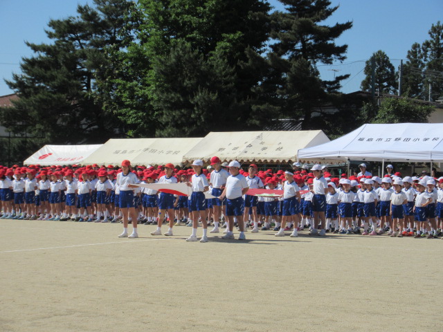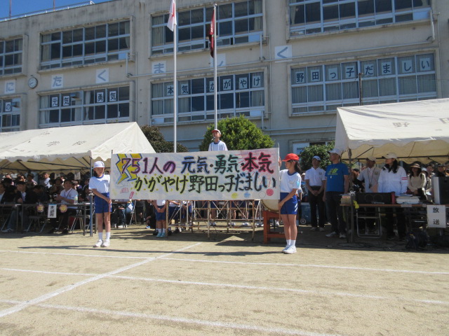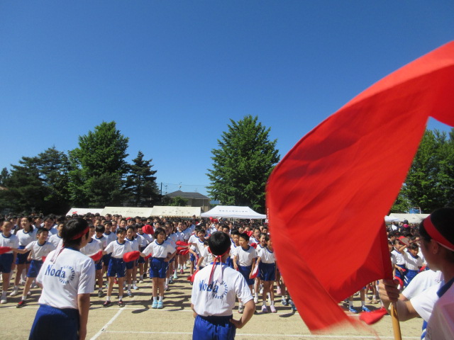 今年の運動会のスローガンは「751人の元気・勇気・本気 かがやけ野田っ子だましい」です。赤組が優勝を果たしましたが、もちろん白組児童のファイトもすばらしいものでした。応援・お手伝いいただいた地域の皆様、ありがとうございました。