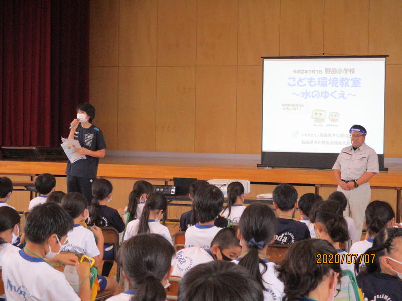 県の浄化槽協会福島支部の方が、野田小学校を訪れ、水についてのお話をいただきました。パックテストを行って水の汚れを実際に見てみたり、汚れをきれいにする浄化槽や、それを助ける微生物を顕微鏡で観察したりと、貴重な体験をすることができました。