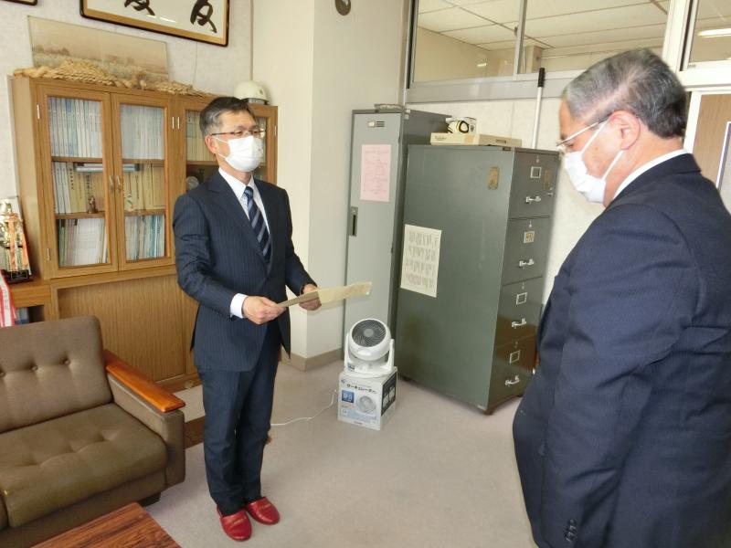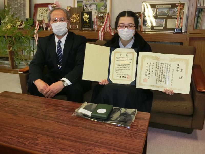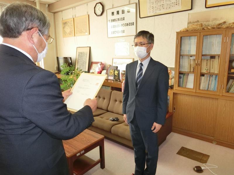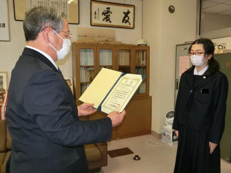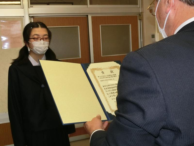 JICA主催の国際協力中学生・高校生エッセイコンテスト2020で 『二本松青年海外協力隊訓練所 所長賞』を受賞した生徒に、本校校長から表彰状を伝達しています。