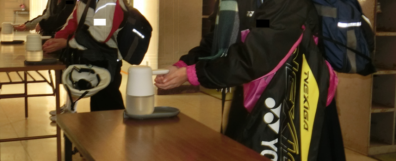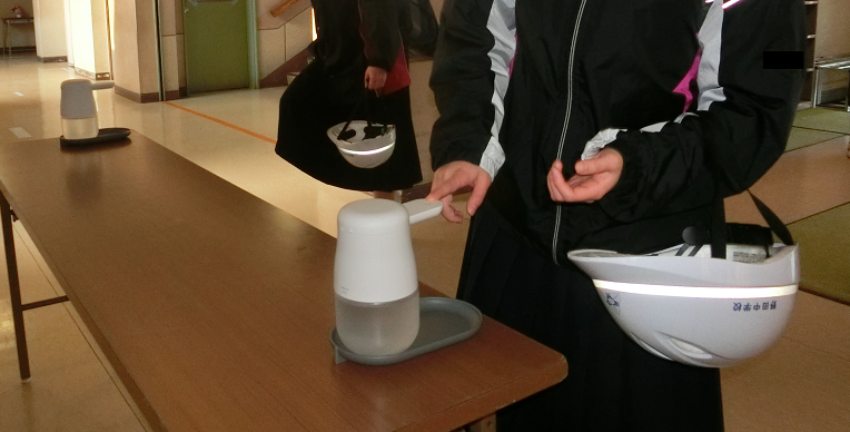 翌朝から、生徒昇降口と事務室前に設置して使用を開始しました。