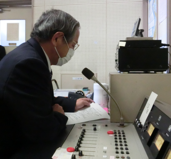 校歌CDを聴いた後、生徒会会長あいさつ、校長先生のお話へと進みます。