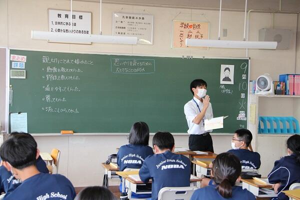 本校で実習を行った皆さんは、職員の意図を汲み、生徒に寄り添い、「もし自分が学校の先生だったら…」と真剣に考えながら、一生懸命に学んでいました。世間では「教師不足」が深刻な問題になっています。本日は大学の先生方が来校し、実習の様子を参観するとともに、早期の教員育成システムについて説明されました。このような機会に、教師という仕事のすばらしさに気付き、子どもと気持ちが通じ合う喜びを味わってもらいたいなあと感じた出来事でした。教員免許をお持ちの方、これから教師を目指す方の情報などがありましたら、ぜひともお寄せください。