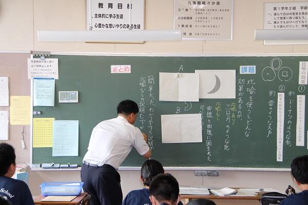 2学期が始まって1ヶ月が過ぎました。行事が次から次へとやって来る慌ただしい2学期ではありますが,年間指導計画の半分ほどが経過した今、教師にとっては、互いに授業を参観し、指導技術を高め合う絶好の時期です。盛んに研究授業を行っています。1年生の国語科では、比喩表現の効果を考える授業において、言葉を使って相手に伝えること楽しむ活動が。2年生の英語科では、級友の向いている仕事とその理由を伝え合う活動が。3年理科では、斜面を下る台車の実験をとおして、斜面の傾きと物体にはたらく力と速さの変化の関係を学ぶ活動が展開されました。本校生徒の学習状況を観察すると、非常によく頑張っています。我々教師は、「現職教育」という校内の研修システムにおいて、説明活動により伝え合いや振り返りによる何をどのように学んだのか確認することなどが、学力向上に向けて有効に機能しているかを検証しています。その検証の場のひとつが研究授業です。ご家庭におかれましては、授業内容を聞いて語り合うなどして、保護者の皆様にも知っていただくとともに、お子様が「授業内容を伝えること」で、一層深い定着につながるといいなあと思っています。