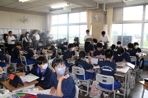 参観した先生方からは、「欠席者がなく、一人一人が学びに向かう姿がすばらしい」といったお褒めの言葉をいただきました。本校は、ほぼ全員が野田小学校から入学する中学校ではありますが、新しいクラスの仲間と中学校生活をスタートすることに関しては、たくさんの不安があったことと推察します。学校生活に徐々に慣れて、不安なことを少しずつクリアし、授業の様子を他校の先生方に参観されていても、いつも通りにグループ内で話し合い、発表する様子に3ヶ月の成長を感じました。