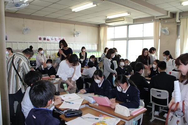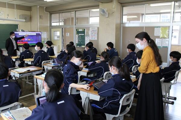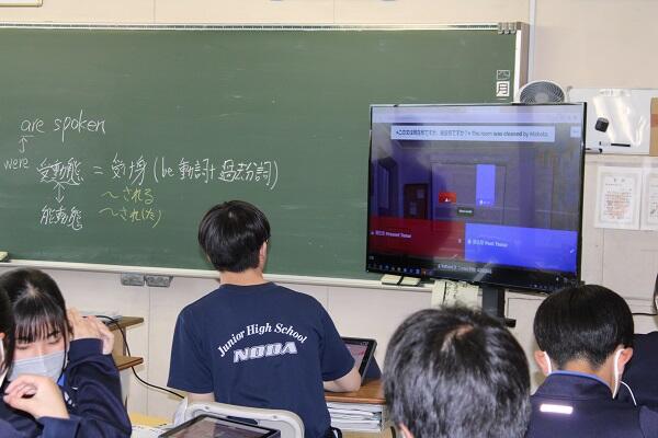 中学校の各教科の授業においても、ICTが様々な形で活用されています。3年生の授業を見に行くと、大型テレビに映し出されたQRコードをタブレットで読み取り、学習したばかりの「受動態」についてのクイズに答えていました。アニメーションが回答意欲を駆り立て、楽しみながら学習していました。正答率や回答の速さなどがリアルタイムで分析されていて、理解の度合いを認識し、復習していました。恥ずかしい話ですが、「これどうやって作ったの?」「いつの間に作ったの?」「生徒が慣れているので、いつもやってるの?」など疑問が次々とわいてきました。コロナ禍の間に、急激に進化したことはわかっていましたが…。