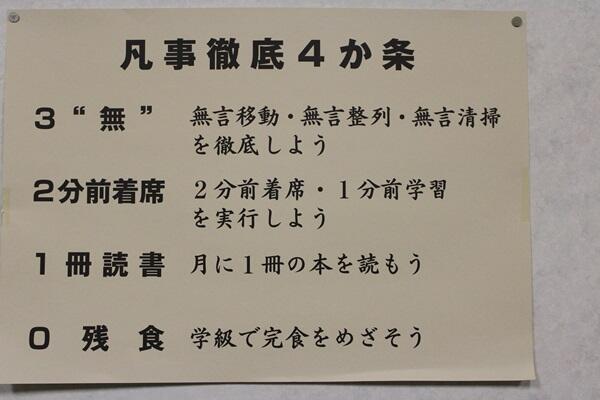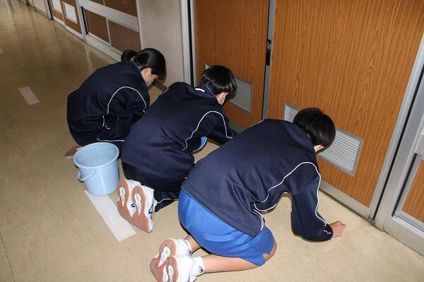 校舎内に掲示されている凡事徹底4か条の最初が「3無」で、無言清掃はそのひとつです。口は動かさずに、ひたすら清掃に取り組む時間は、伝統の重みを感じるすばらしい時間です。一人一人が何をすべきかわかっているので、指示されなくても次の行動に移すことができます。校舎内の清掃の様子を見てまわったとき、心からそう思いました。