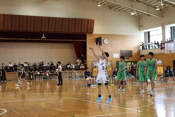 本校男子バスケットボール部は、平成10年全国中学校バスケットボール大会で全国3位となった実績がある伝統ある部です。支部大会のブロック決勝においては、一時は9点差をつけられリードを許すも逆転し、追い詰めたのですが、終盤に再逆転を許し、悔しいブロック準優勝でした。しかし、両チームとも全力を尽くしたナイスゲームでした。また、相手チームのベンチには、本校が全国3位になった時の監督さんの姿があり、保護者や地域の皆様の中には、当時を知る方がいるという、歴史の重みを感じる一戦でした。県北大会で再び対戦することになっています。