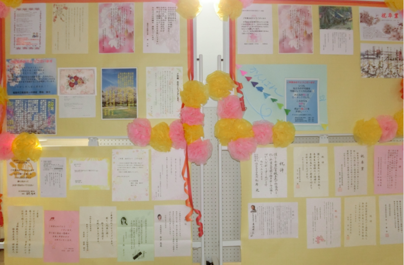登校時間帯は、午前8時50分~9時5分です。多数寄せられた祝電を読んだり、廊下で過ごしたりしながら、最後の学級活動の時間を待ちます。