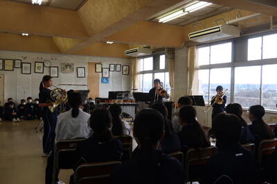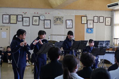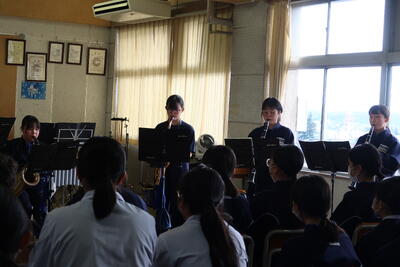2024年12月5日 10時28分本日、昼休み音楽室にて、吹奏楽部ミニコンサートを開催しました。1、2年生19名の部員が金管四重奏、木管七重奏、管打楽器八重奏を披露しました。息の合った演奏が終わると、音楽室全体が大きな拍手と笑顔に包まれました。吹奏楽部のみなさんが、チケットの作成や会場準備等を含めて心を込めて行ったため、和やかなひとときを過ごすことができました。12/7(土)に開催されるアンサンブルコンテストでも、良い演奏ができることを祈っています。