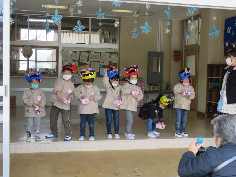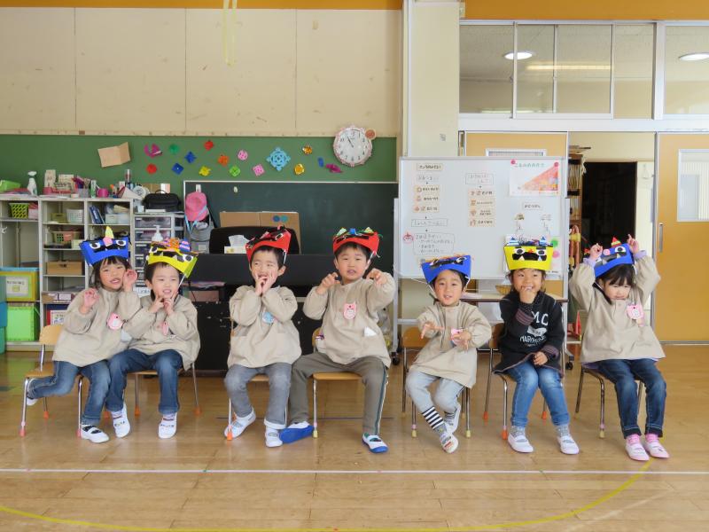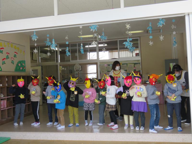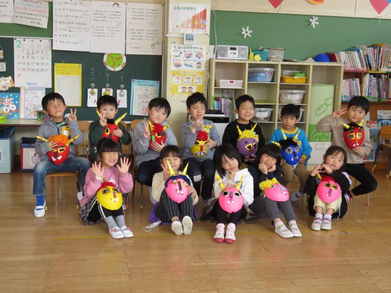 他の行事の都合から、恒例の「豆まき会」を1日遅れで昨日行いました。うさぎ組もきりん組も、それぞれに自分の「鬼」のお面の製作を頑張り、「こわ~い鬼」のお面をかぶり、子どもたちの心の中にある「わる~い鬼」を追い出すよう、豆まきもしました。