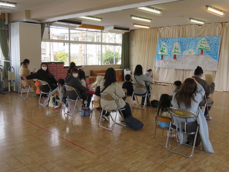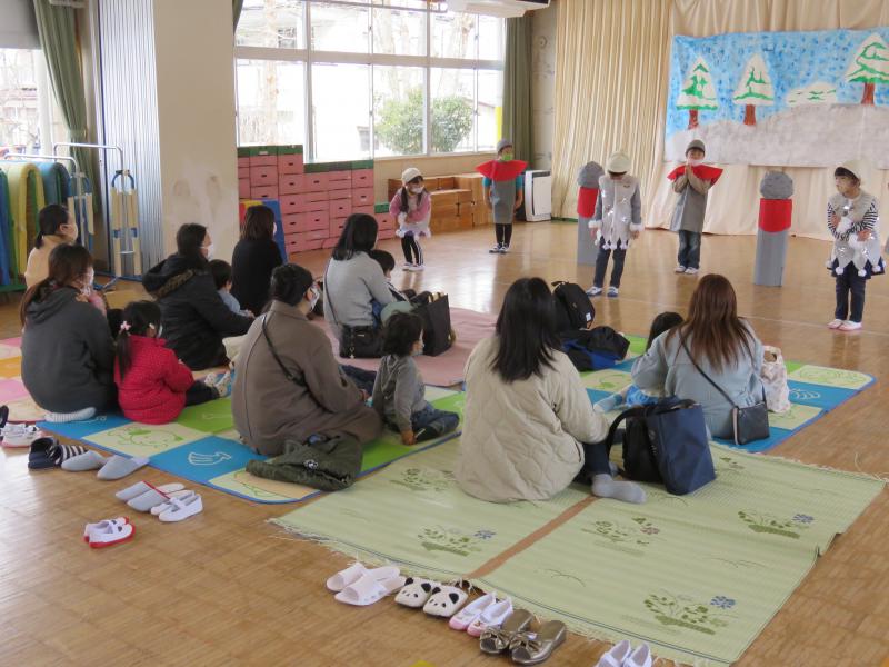 次に、遊戯室で、きりん組・うさぎ組のみんなが、「生活発表会」で披露したオペレッタとダンスを発表してくれました。お母さんたちはもちろん、子どもたちも真剣に先輩たちの演技を見てくれました。僕たち・私たちは、幼稚園の生活をとおして、こんなに成長することができました