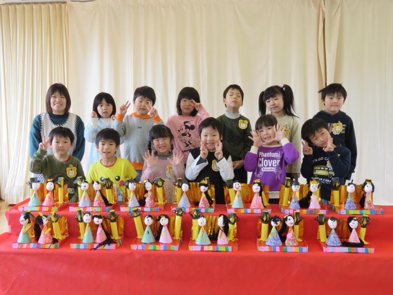 子どもたち一人ひとりが手作りしたおひな様を前に、みんなで記念写真