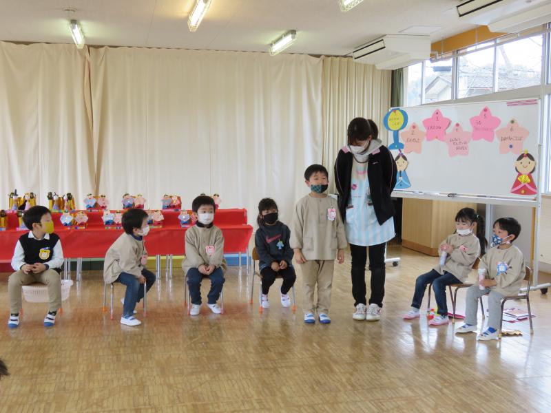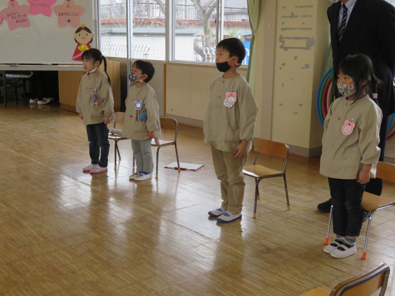 今までのお集まりでは、年長のきりん組さんを中心に進めてくれましたが、今回は、役割を引き継いだ年少のうさぎ組さんの当番で進めました。きりん組さん、今までありがとう そして、これからは、うさぎ組さん、よろしくね