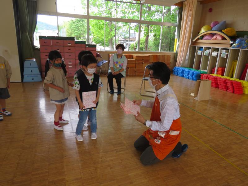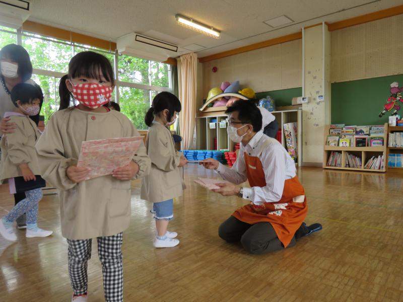 訪問に際し、子どもたちへの励ましの言葉とともに、子どもたち一人一人に「折り紙」とみんなで読んでください、ということで園に「絵本」のプレゼントもいただきました。ありがとうございました。