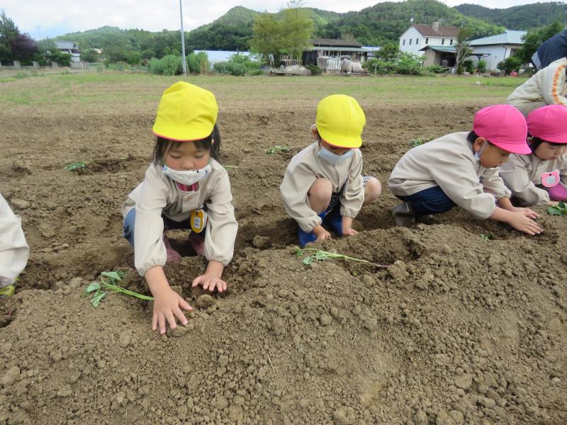 昨日(26日)、きりん組9名、うさぎ組9名の18名みんなで、さつまいもの苗を、畑に植えてきました。いつもお世話になっている清野さんに、植え方を教えていただき、お手伝いのお母さん方にもおいでいただいて、楽しく植えることができました。