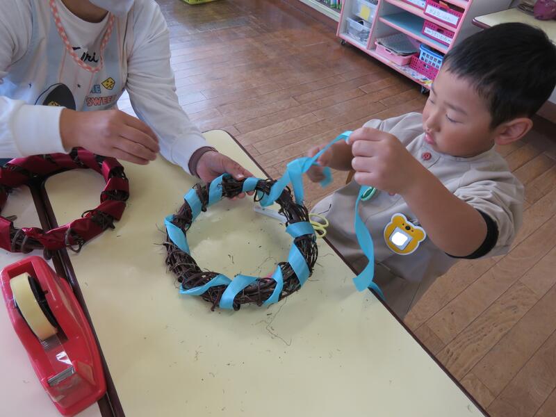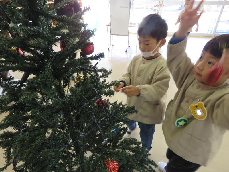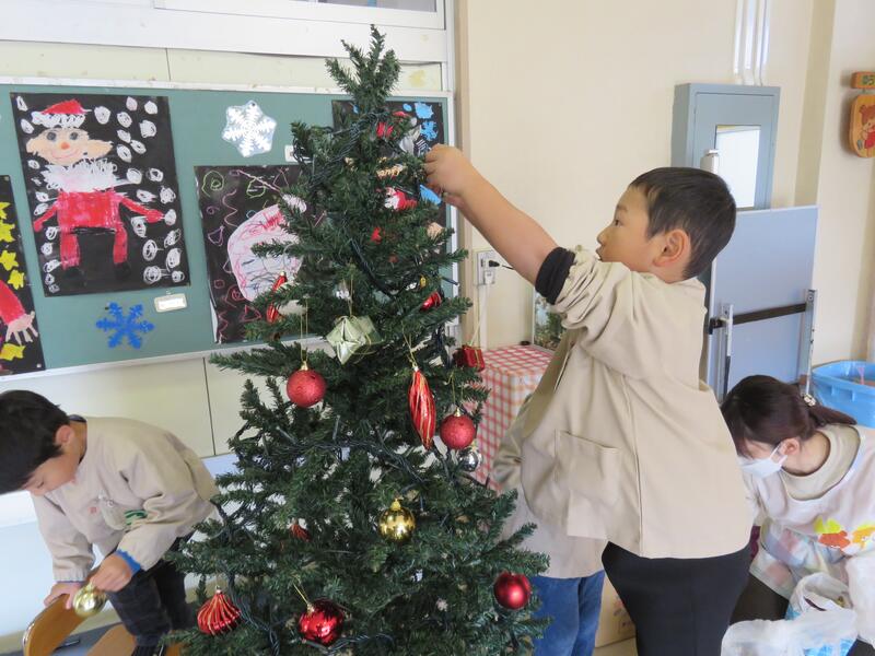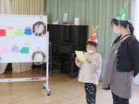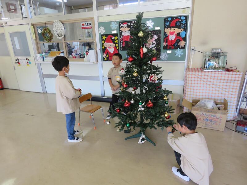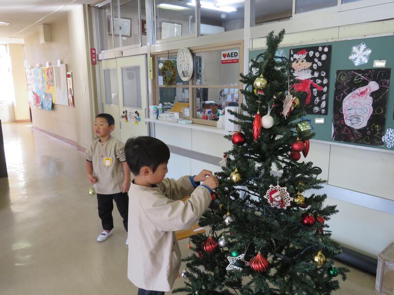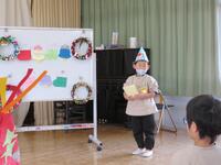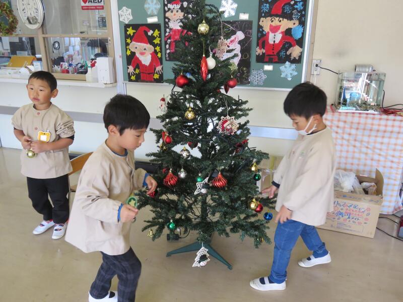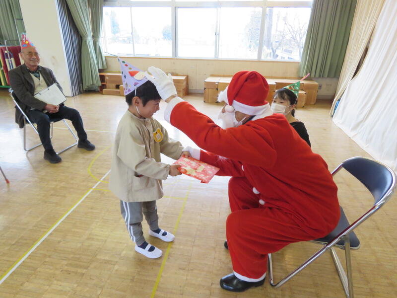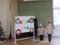 2024年12月13日 07時51分昨日は「お楽しみ会」。子どもたちがクリスマスの雰囲気を味わったり,きりん組全員で会の準備をし,一人一人が自分の力を発揮することをねらいとしています。この日のために学級でリースを作ったりクリスマスツリーを飾り付けたりしました。また,絵本を読んだりして期待感をもってお楽しみ会を迎えました。みんなで帽子をかぶって遊戯室に集まり,いよいよお楽しみ会が始まりました。みんなで「あわてんぼうのサンタクロース」を歌い,リズム「ジングルベル」の演奏が終わるとちょうど雪が降ってきっました。そして,サンタクロースがやってきました。「どうして手袋をしているんですか?」「粗利はどこに留めてきたんですか」「何で赤い色の服を着ているんですか?」などなど,子どもたちから素朴な質問も出ました。ハンドベルの出し物も子どもたちが一生懸命練習した成果