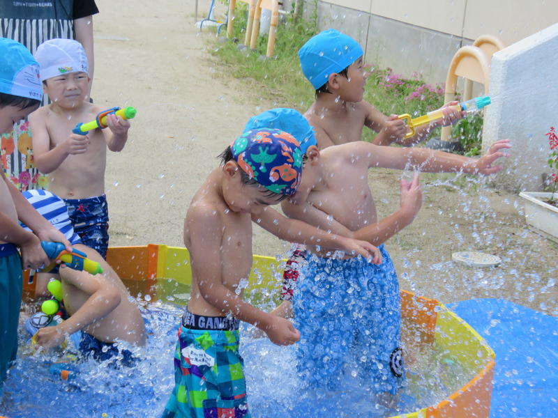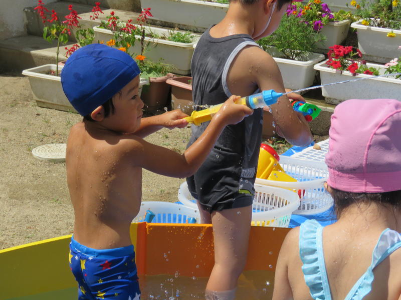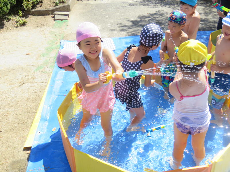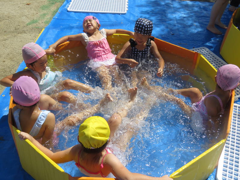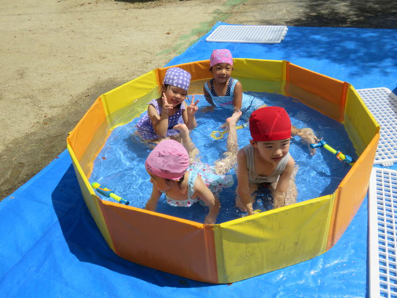 この残暑厳しい中、やっぱり「水遊び」が最高です。学校のプールと違い、毎回水道からの水をビニールプールにためるので、子どもたちにはちょっと冷たいけど、それがこの暑さの中では、きもちいい~!!