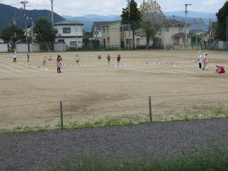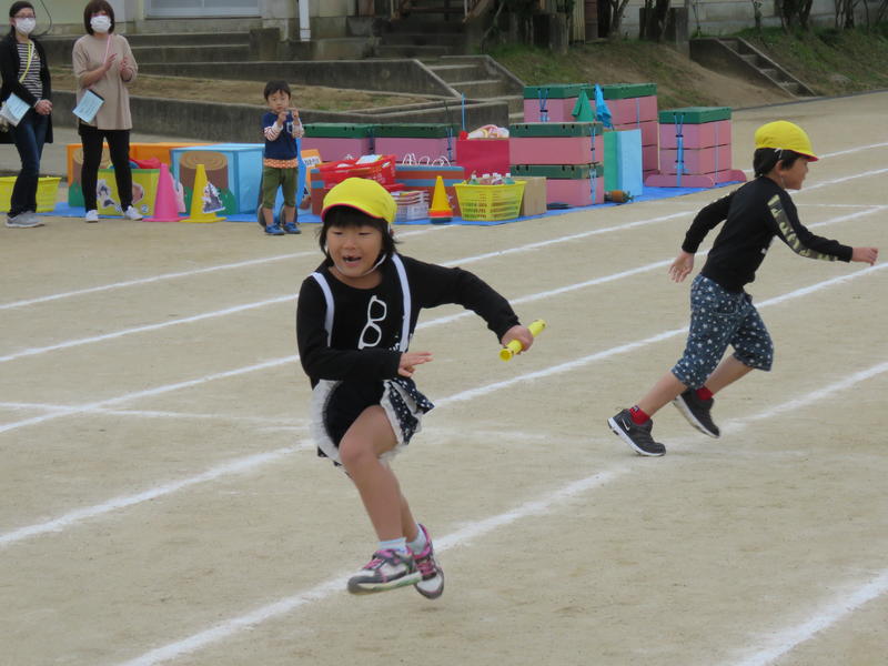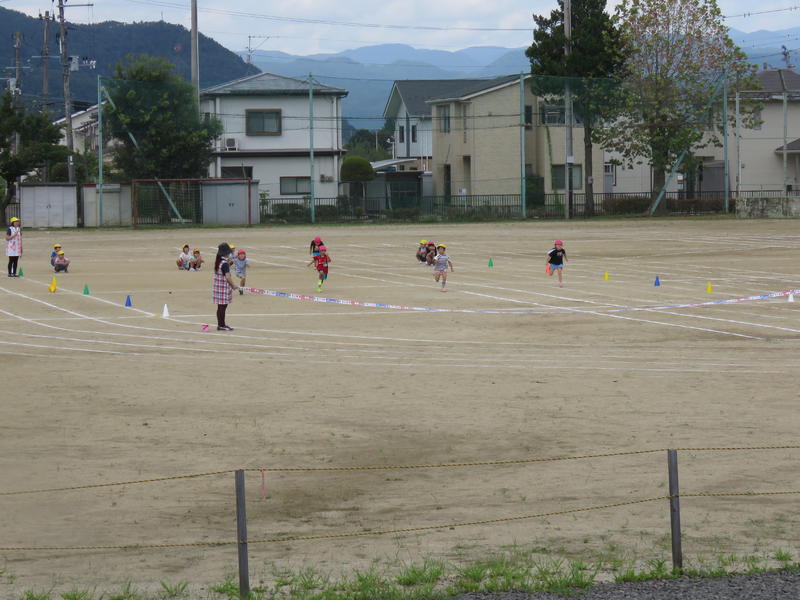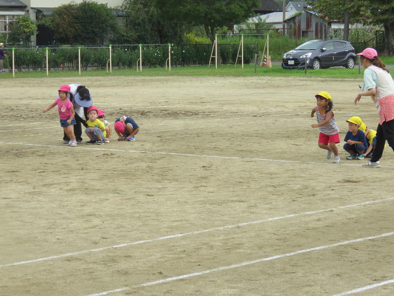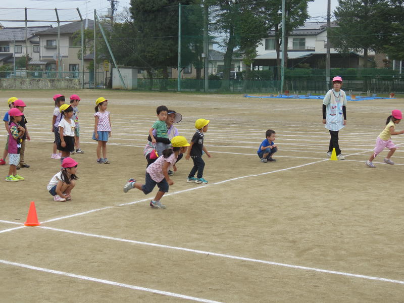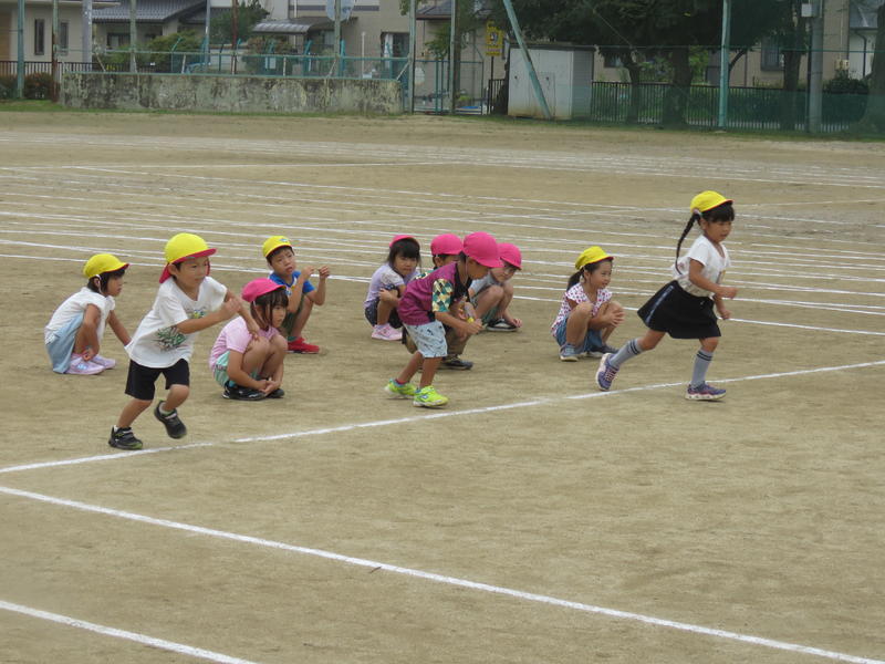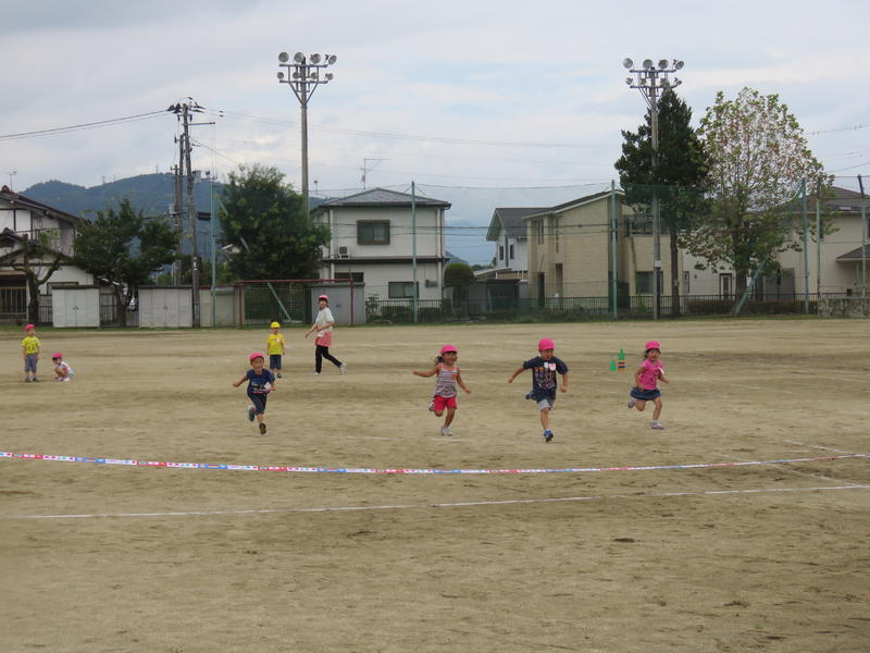 〇 徒競走の練習です。さすが年長さん、去年に比べて走力が上がっています! ゴールテープ目指してゴー!!