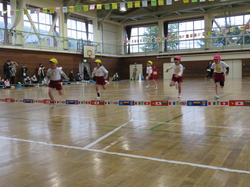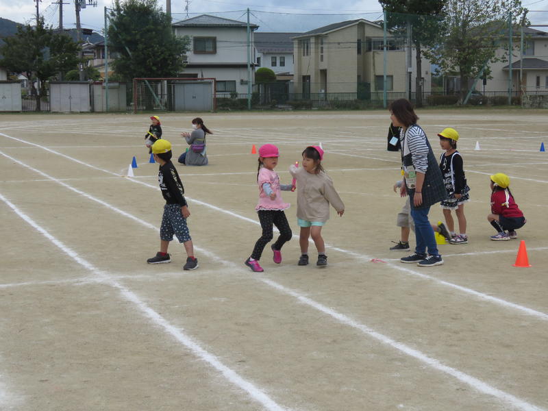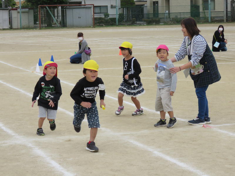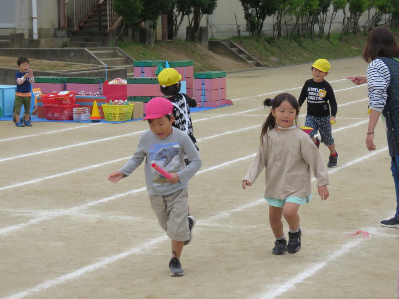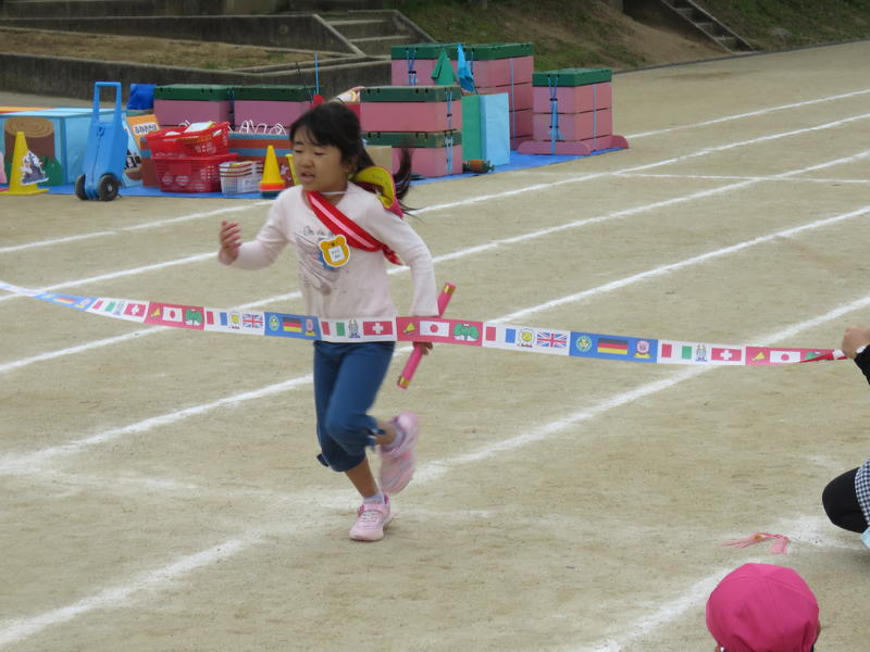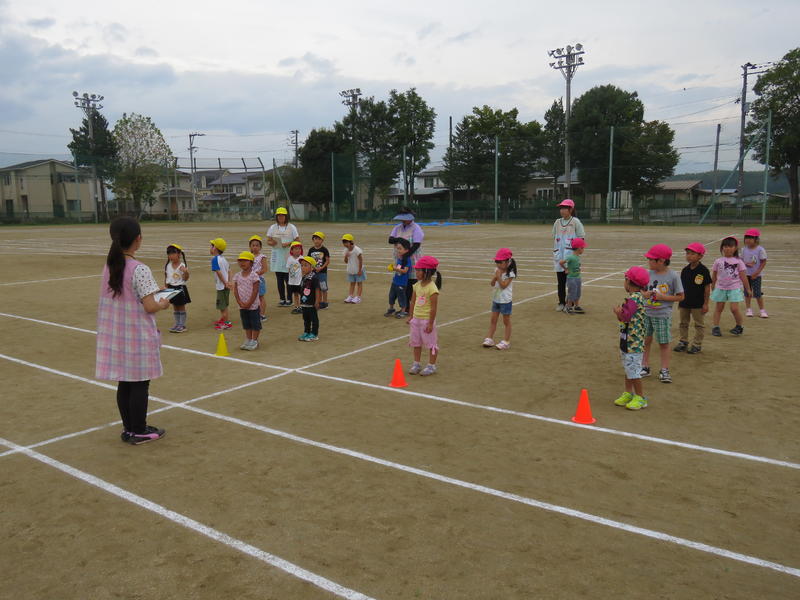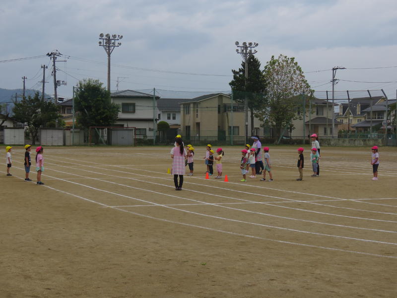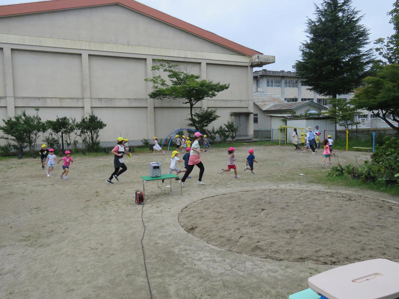 〇 徒競走の練習です。さすが年長さん、去年に比べて走力が上がっています! ゴールテープ目指してゴー!!