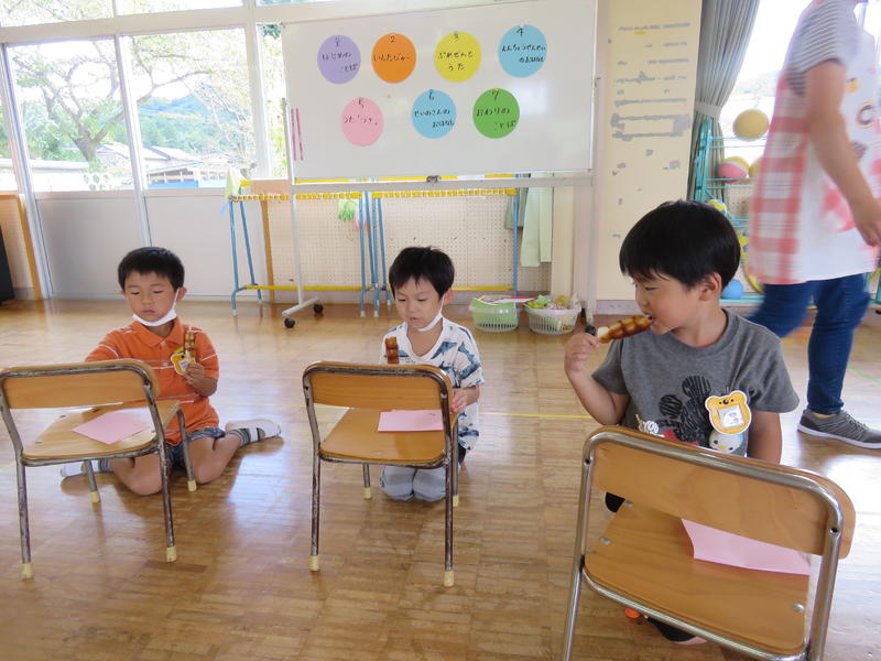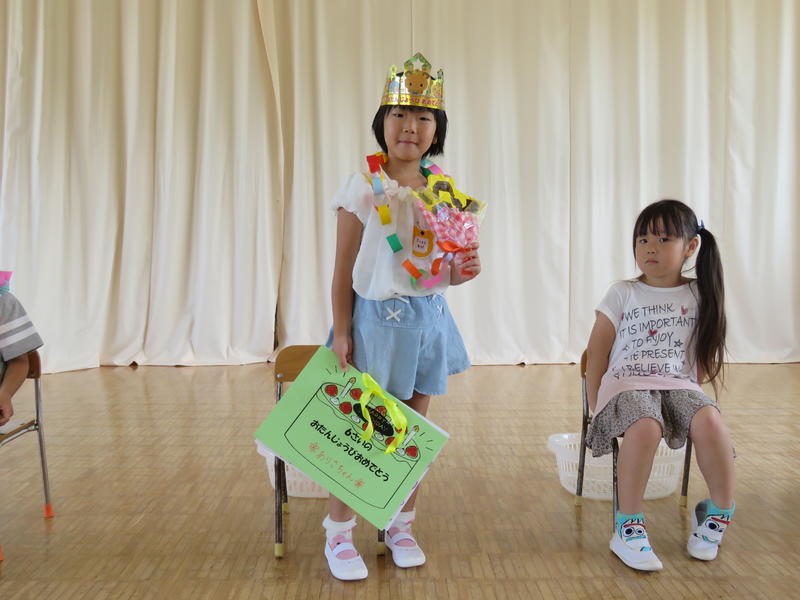 岡山幼稚園では、2か月ごとに「誕生会」を開いています。15日(火)に、『お月見』と合わせて、8月・9月生まれの誕生会を行いました。うさぎ組1人・きりん組2人の3人の女の子のお誕生をお祝いしました。