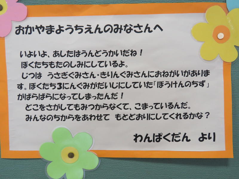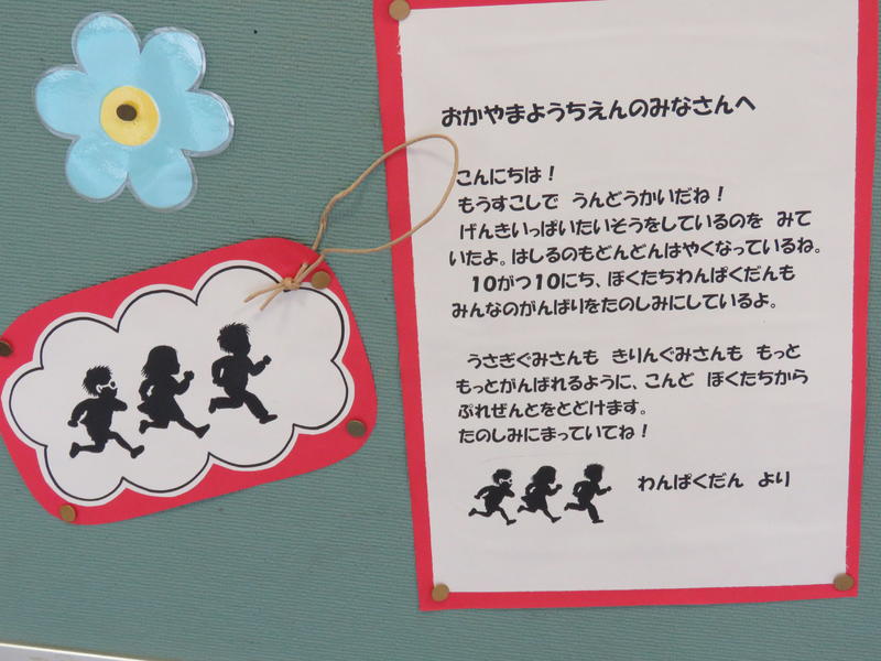 小学校の校庭が使えないときは、体育館をお借りして練習を続けています。そして、練習を終えて、幼稚園に戻ってみると・・・ 玄関に「わんぱくだん」のみんなからの手紙が届いていました!!