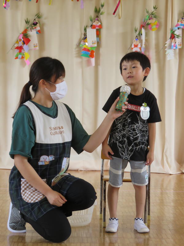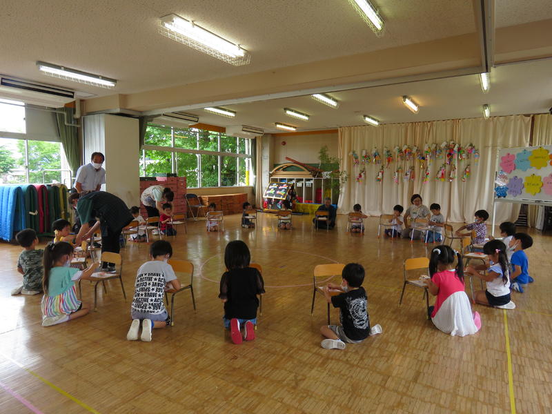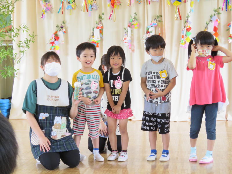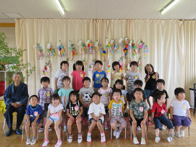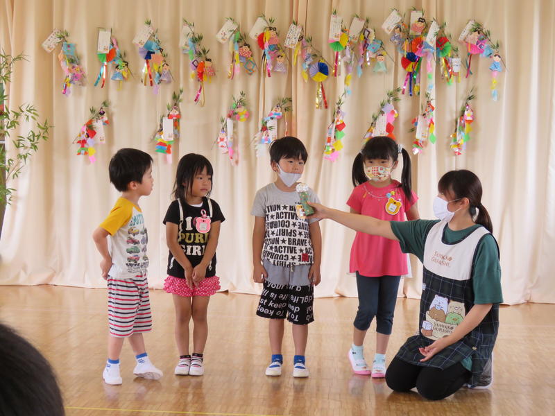 本園では、年間計画として「誕生会」を、奇数月の2か月ごとに実施しています。しかし、第1回目の5月1日『子どもの日 誕生会』は"臨時休園"期間となってしまったので、お祝いすることができませんでした。ということで、今年度初めての「誕生会」を、『七夕祭り 誕生会』として本日実施しました。