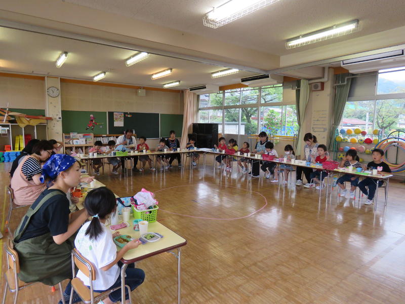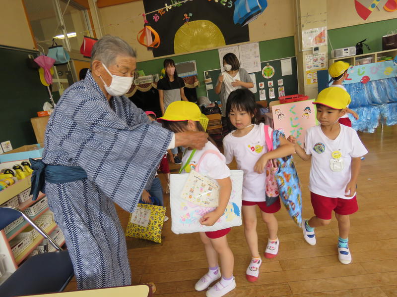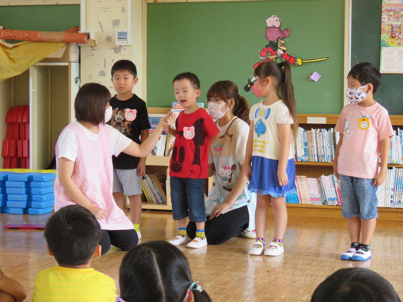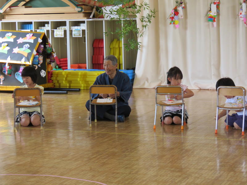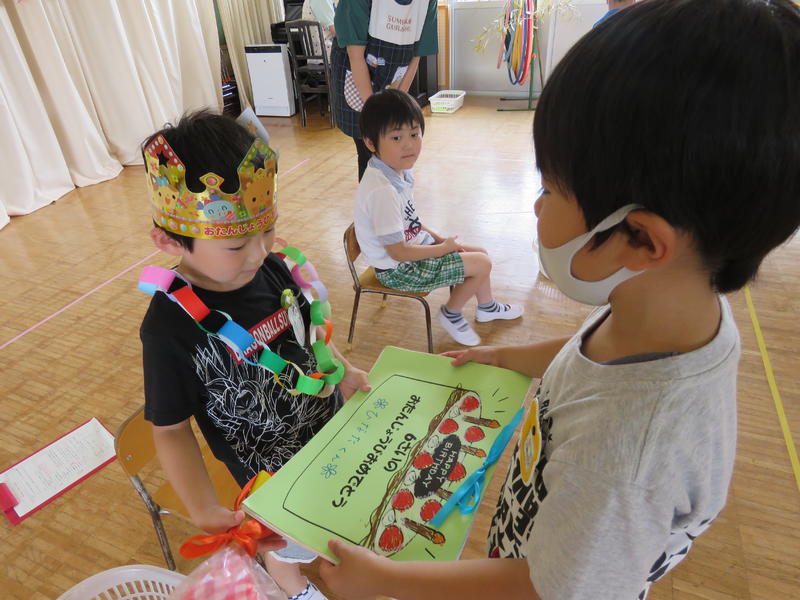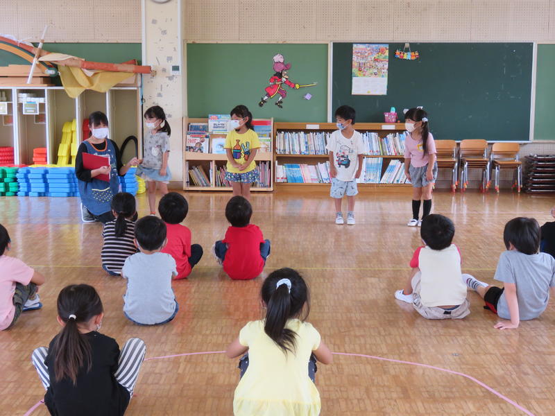 4~7月生まれのお友達のお祝いとなりますが、きりん組(年長)の2人だけのお祝いでした。(4月と6月生まれ)そして、いつものとおり読み聞かせ(畑)ボランティアの「清野さん」にもおいでいただきました。