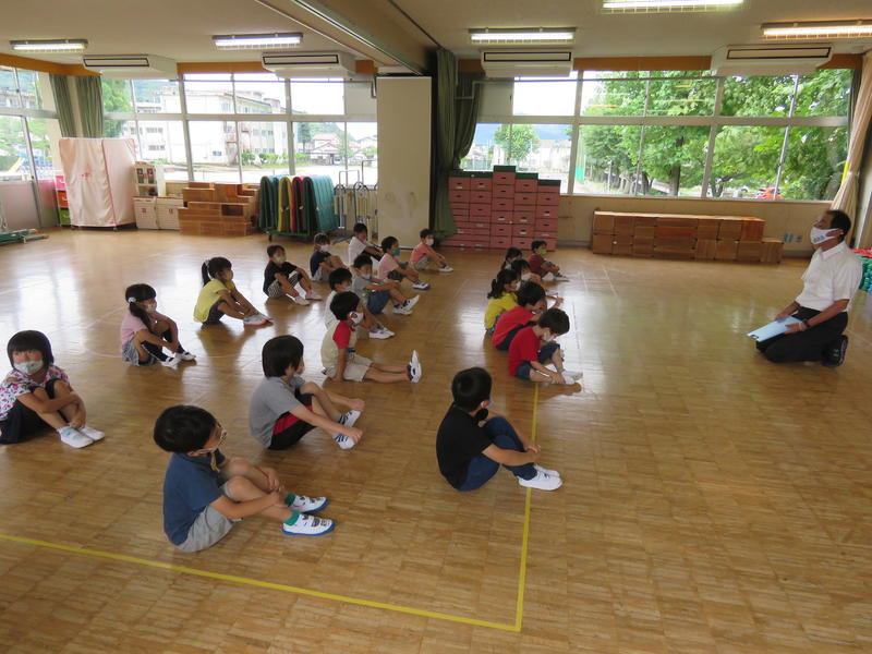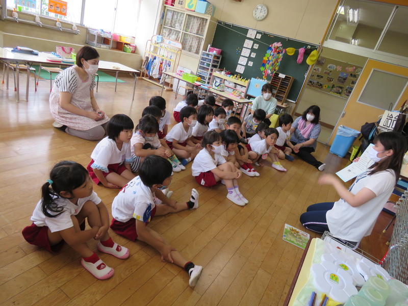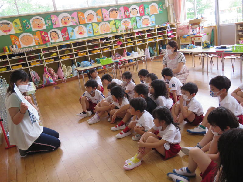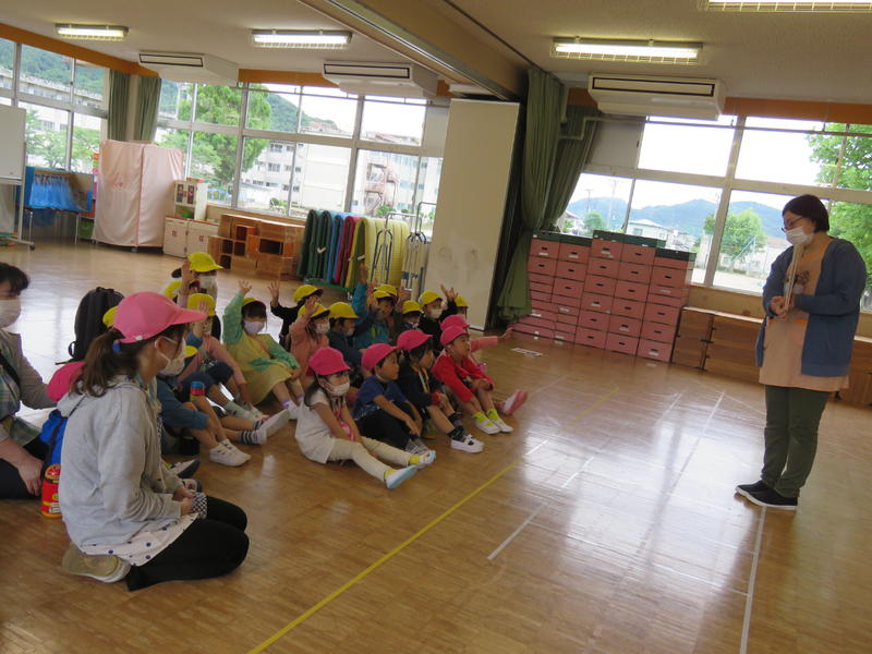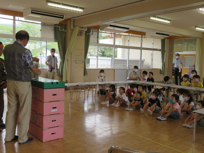 まず、「みーもくんの冒険」という紙芝居の読み聞かせを、2人の案内人の方がしてくださいました。『環境保全』にかかわる内容でしたが、子どもたちは真剣に聞き入りました。