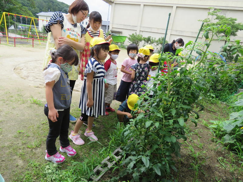 畑に出かける前の時間に、我が家の家庭菜園 園庭で育ててきた野菜等も合わせて収穫・観察しました。