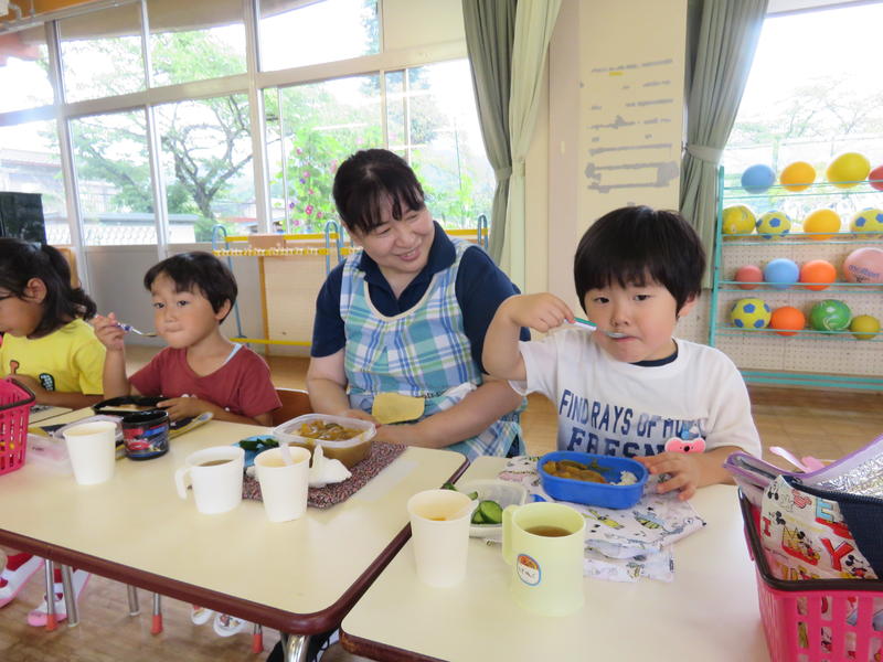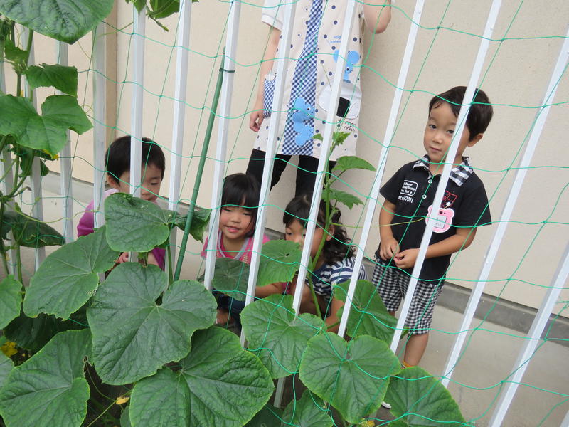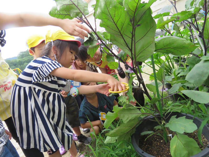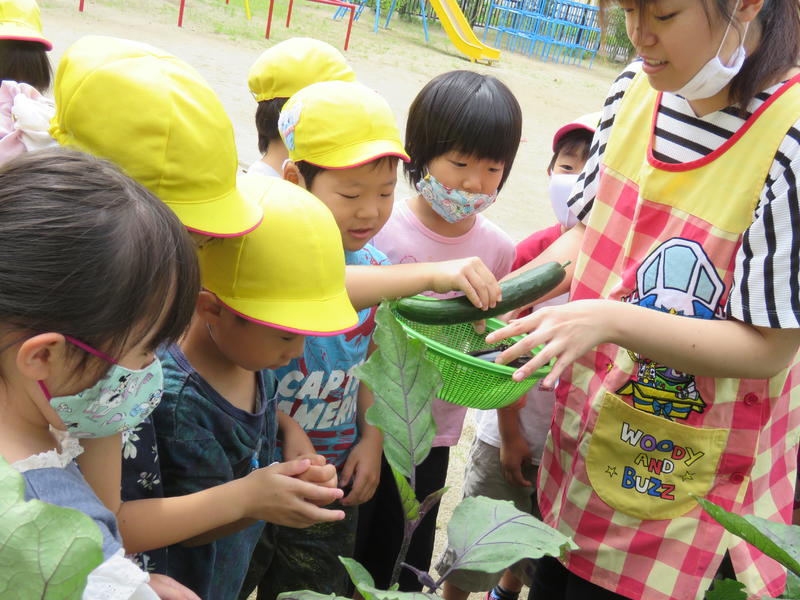 収穫した「きゅうり」は塩漬けに、「なす」はシーチキンとあわせて油炒めにして、お弁当の時間にいただきました。おかわりする子がいるくらい大人気でした。我が家(園)の野菜は格別でした