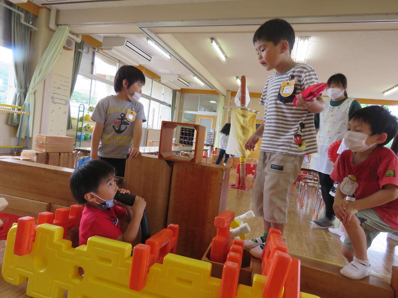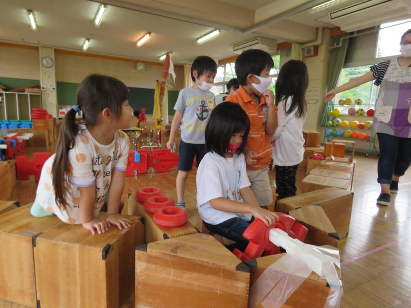 なかよしグループ<うさぎ組[年少]ときりん組[年長]の合同、きりんさんがリーダー>で仲良く・順番に