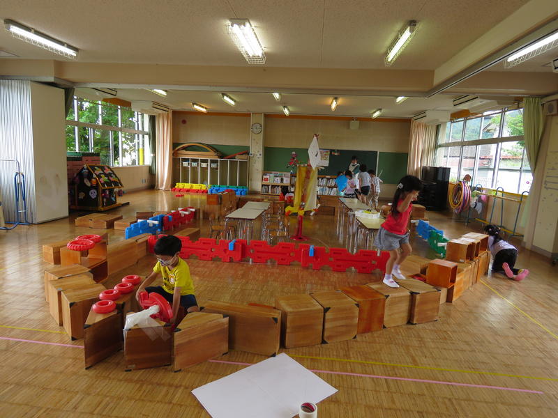 【きりん組】<年長> お遊戯室でダイナミックに制作活動! なにを作っているでしょうか?