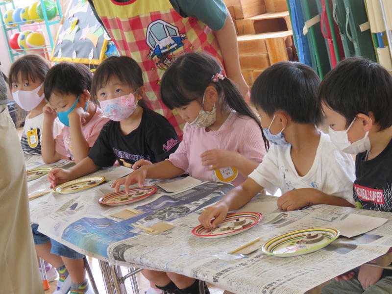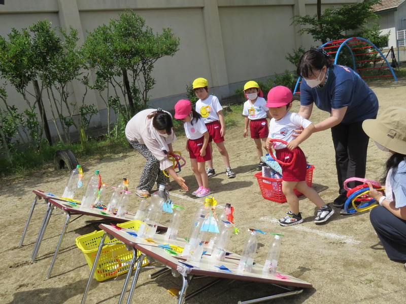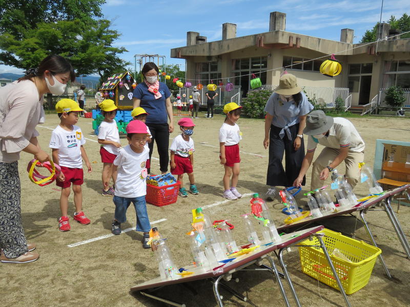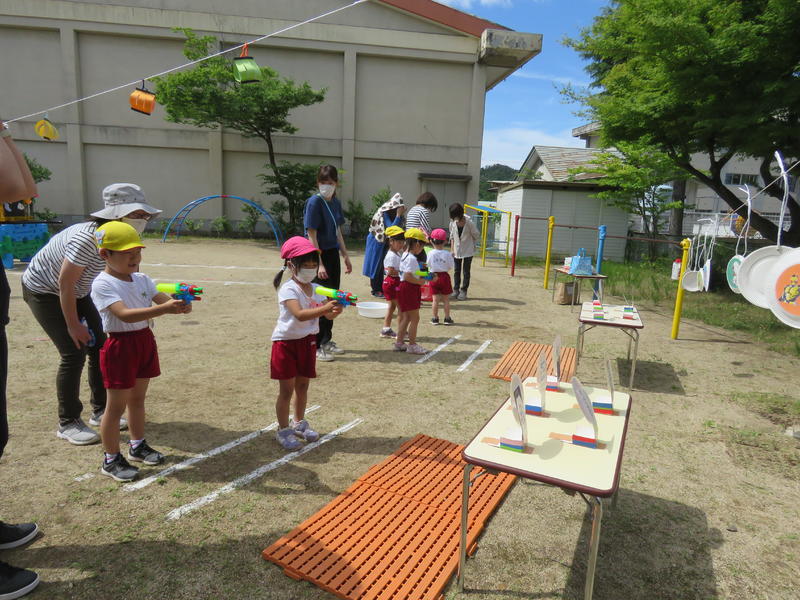 例年のお祭りでは、お部屋(室内)の中で出店<でみせ>を開いていましたが、今回は、開・閉会式は行わず、出店は、園庭に並びました。雨の心配はない予報でしたが、暑いくらいのいいお天気に恵まれ、みんな汗だくになって頑張りました。岡山の子どもたち・保護者の皆さんの日頃の行いの良さが表れました!