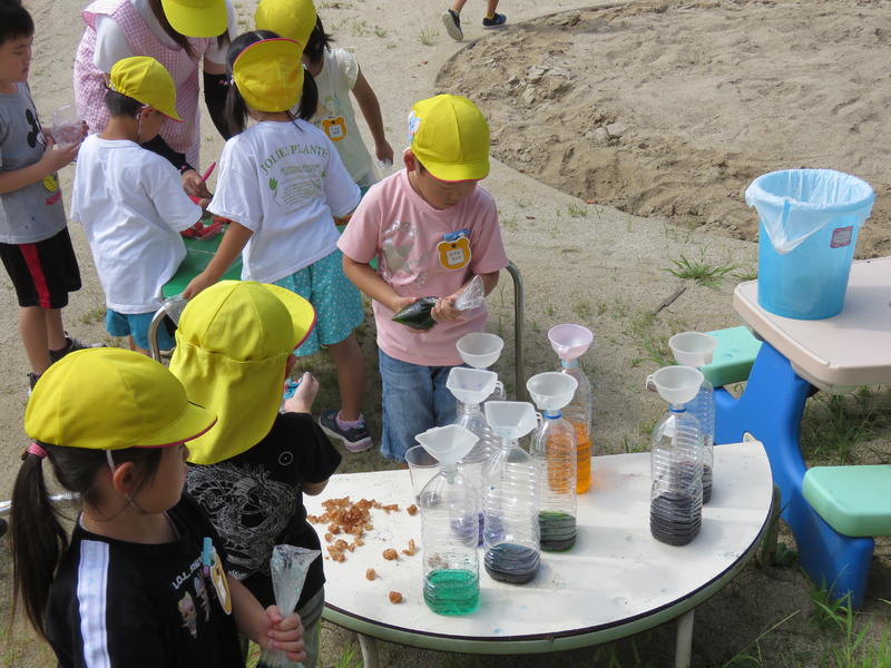 うさぎ;虫とり「バッタがとれたよ」(秋の気配) きりん;色水遊び「きれいな色ができた。」