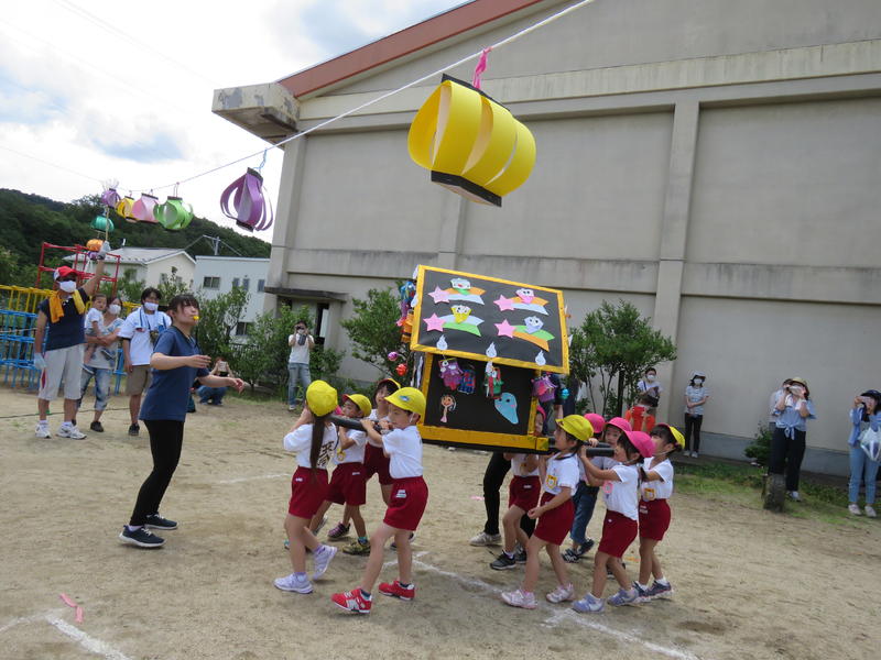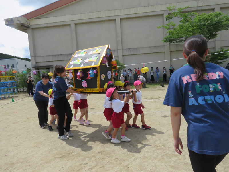 なかよしグループを2つに分け 手作り「おみこし」をかついで