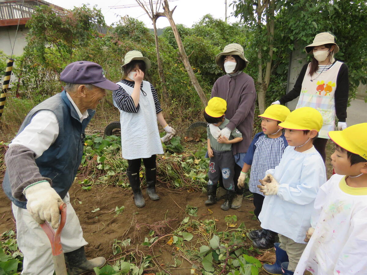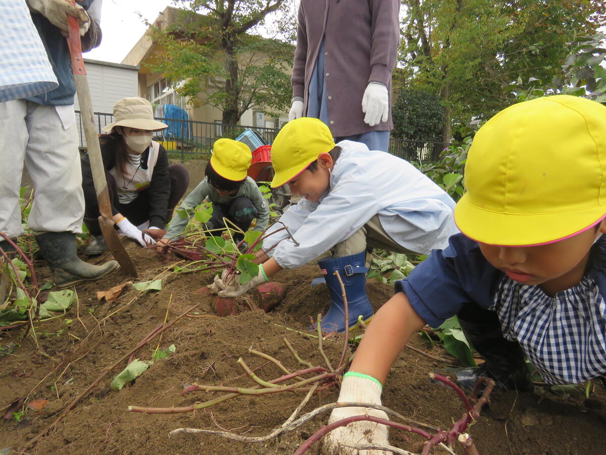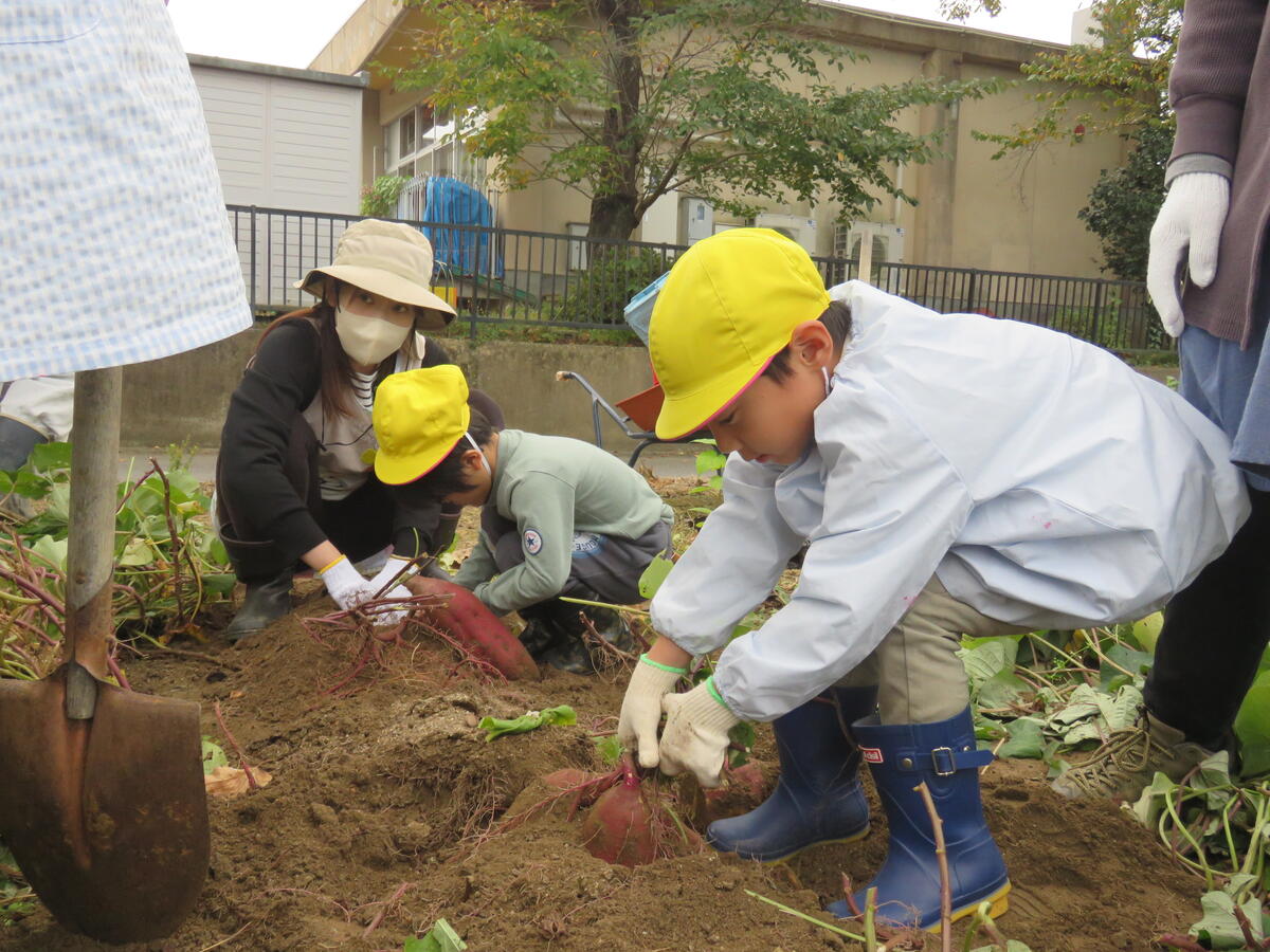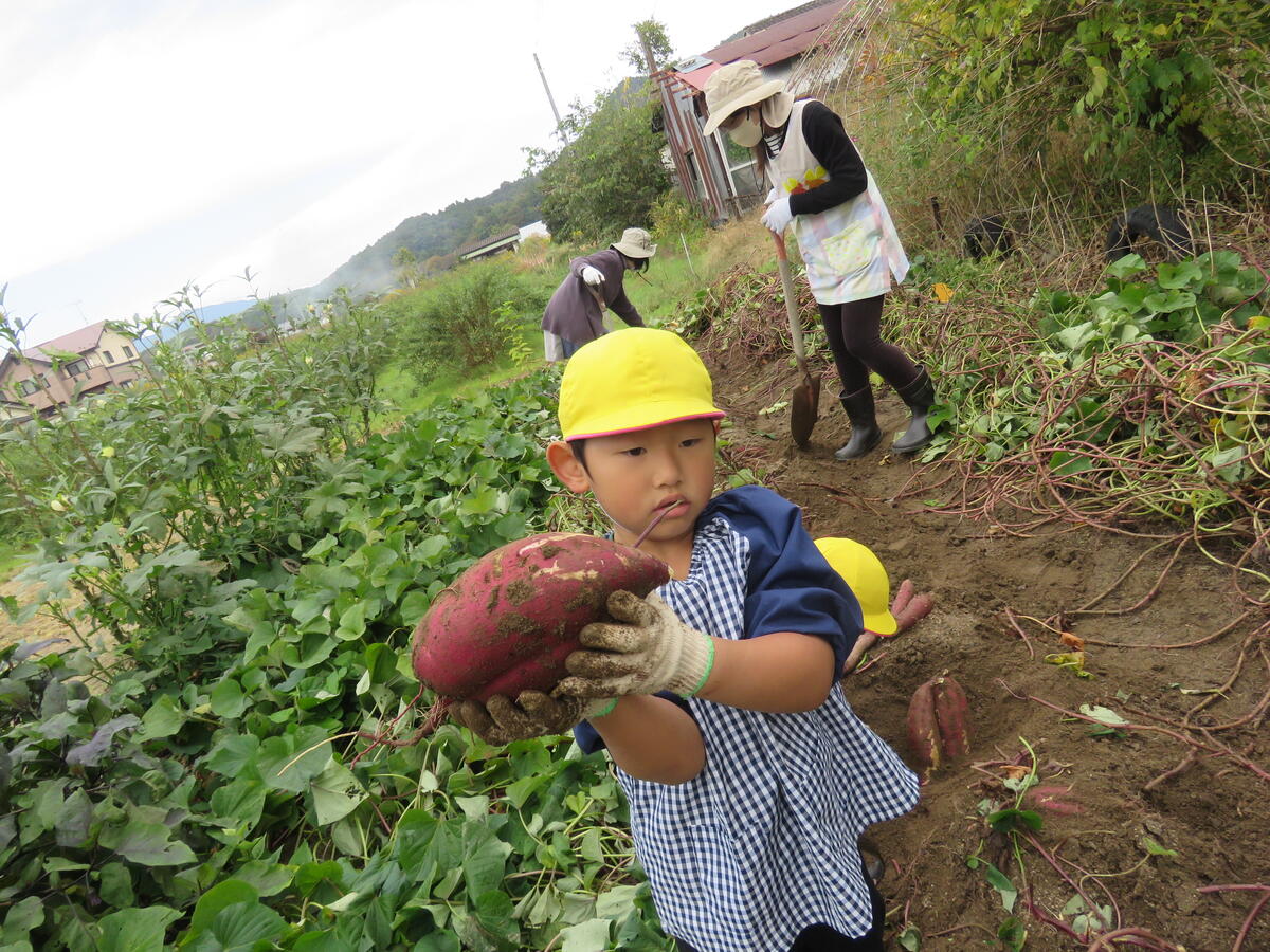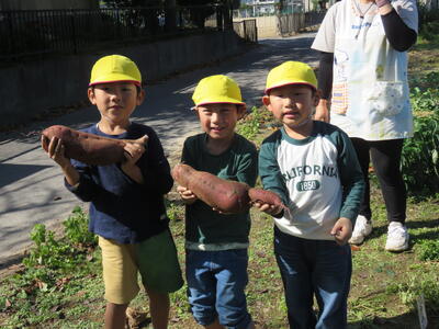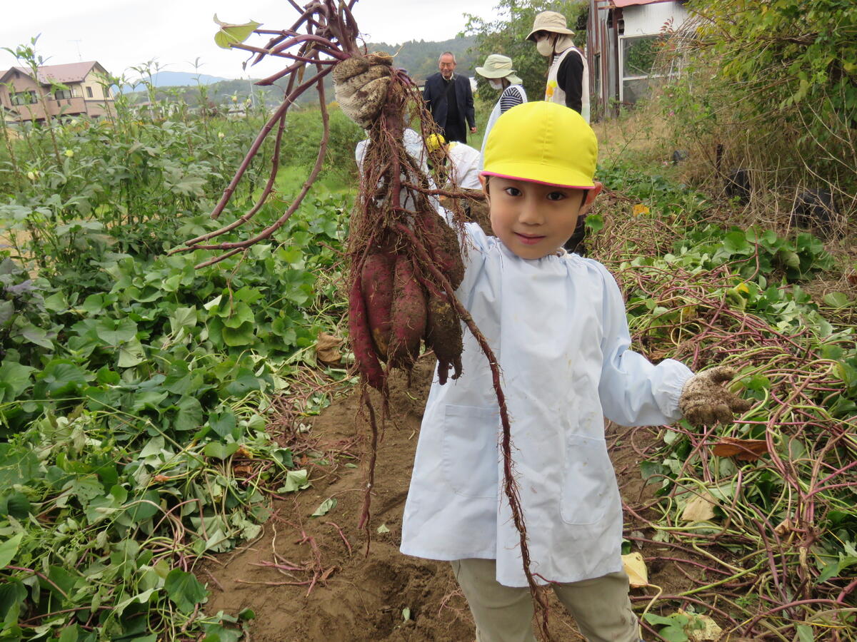 はじめの会の後,焼き芋をごちそうになりました。甘い焼き芋をほおばりニコニコの笑顔でした。その後,好きな遊びをしたり野菜を収穫したりと存分に楽しみました。お昼にはみそ汁やフルーチェも食べながら交流を深めました。