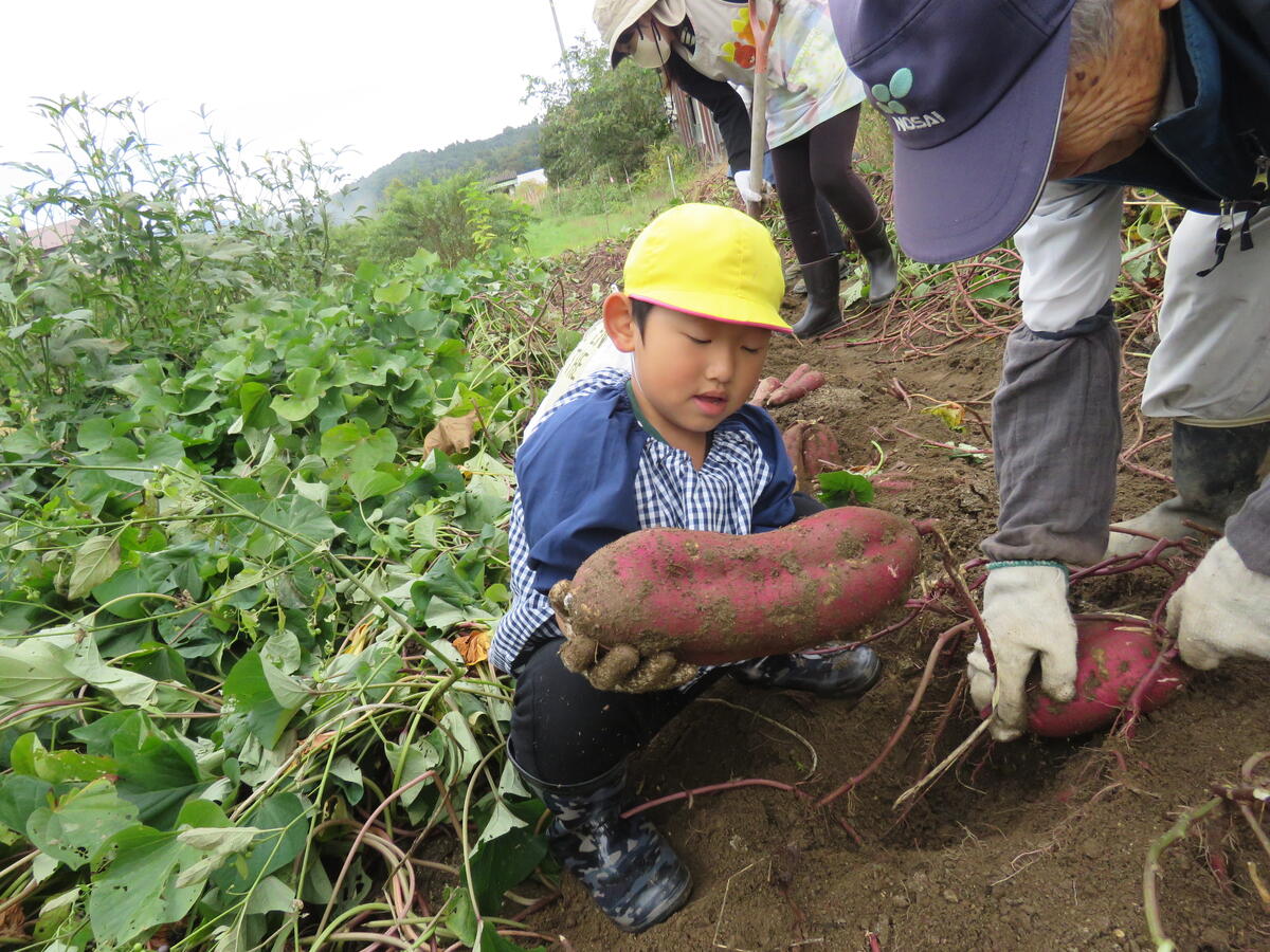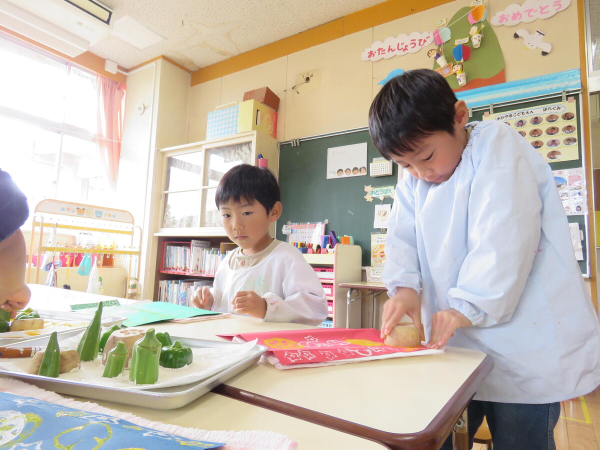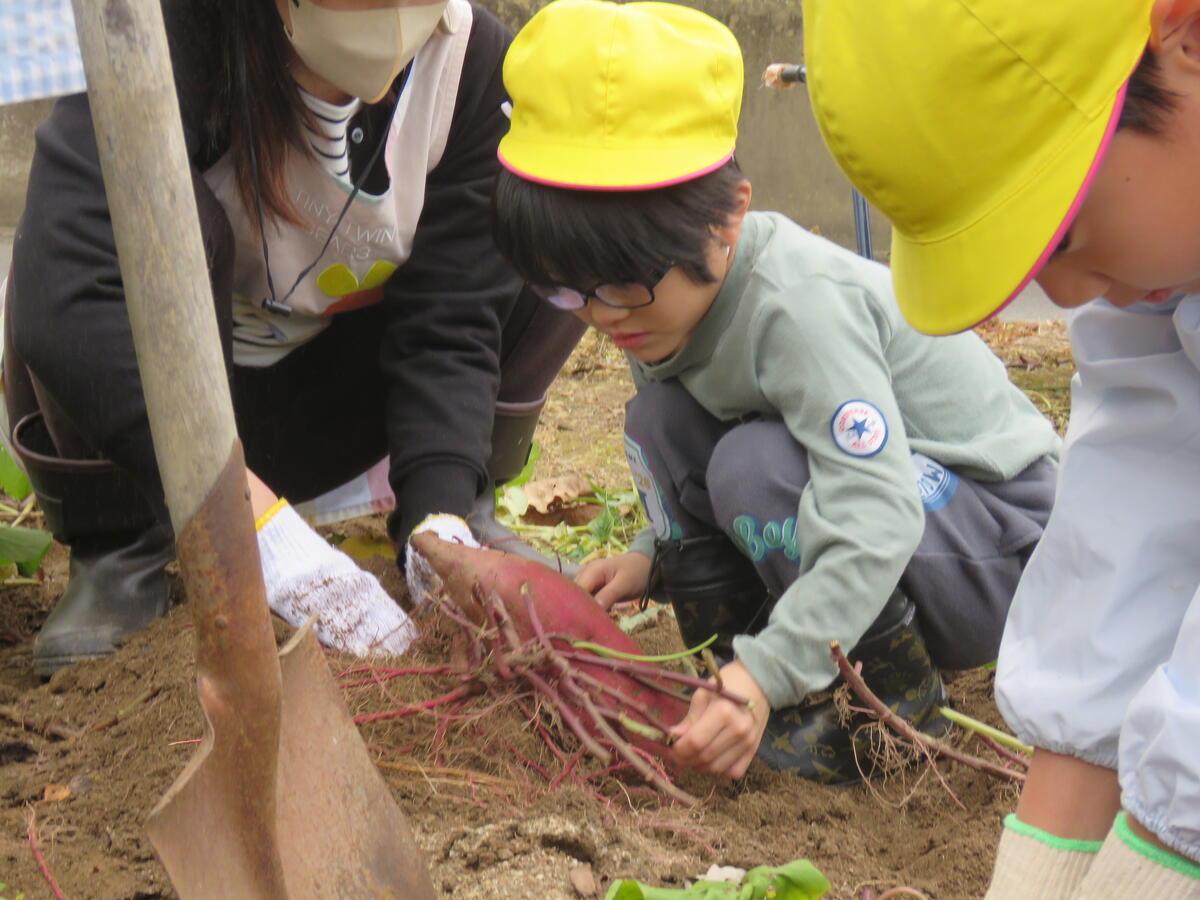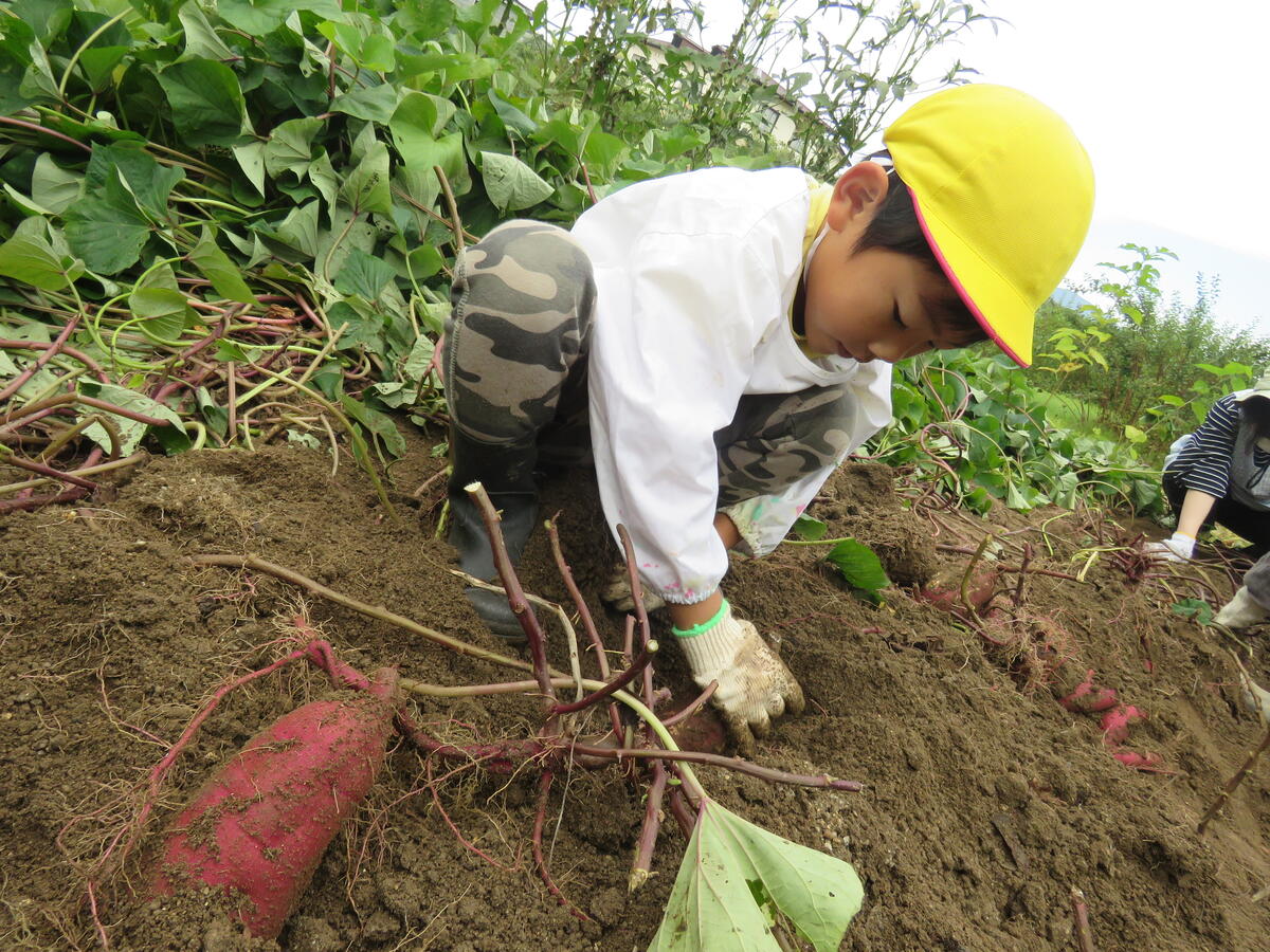 はじめの会の後,焼き芋をごちそうになりました。甘い焼き芋をほおばりニコニコの笑顔でした。その後,好きな遊びをしたり野菜を収穫したりと存分に楽しみました。お昼にはみそ汁やフルーチェも食べながら交流を深めました。