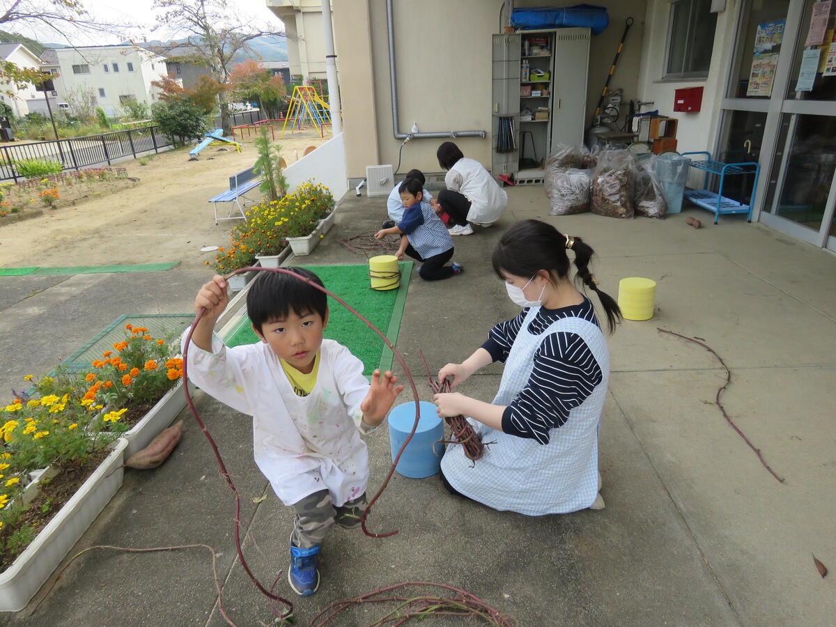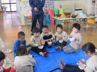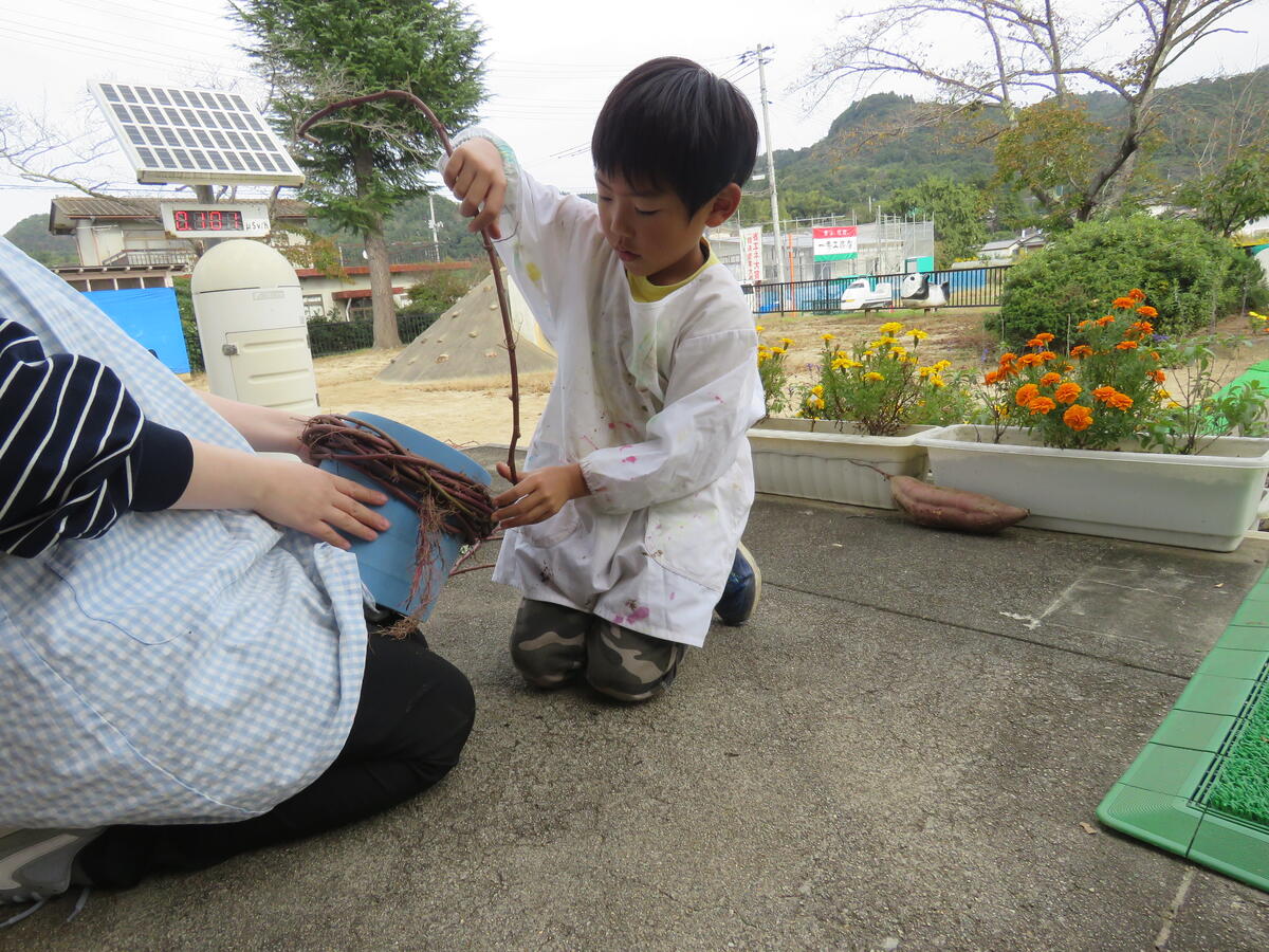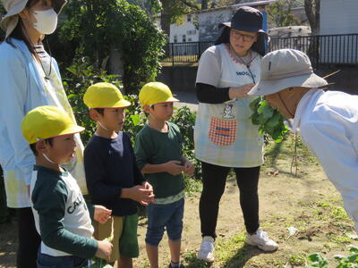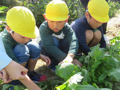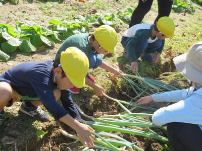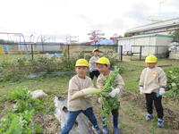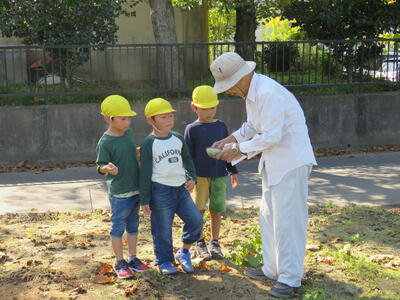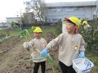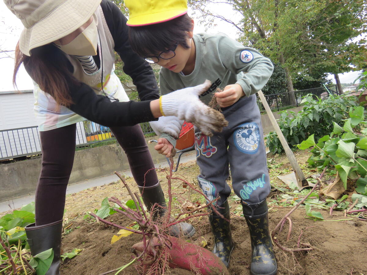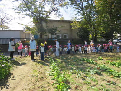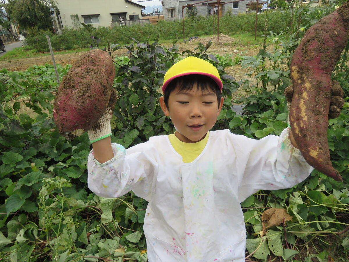 はじめの会の後,焼き芋をごちそうになりました。甘い焼き芋をほおばりニコニコの笑顔でした。その後,好きな遊びをしたり野菜を収穫したりと存分に楽しみました。お昼にはみそ汁やフルーチェも食べながら交流を深めました。