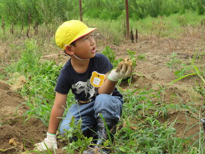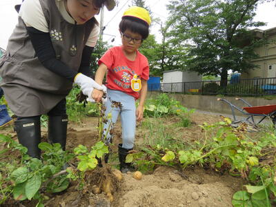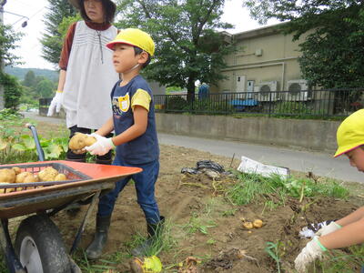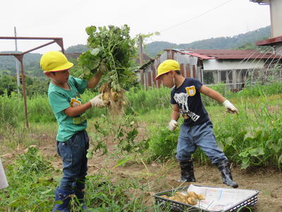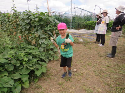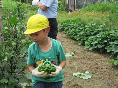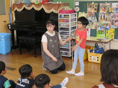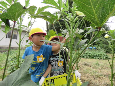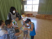 はじめの会では,すっかり顔なじみとなった庭塚幼稚園児と「昆虫太極拳」を踊り,次に「ろくむし」をして遊びました。リレー競争をした後,好きな遊びの時間には野菜の収穫をしたり,砂場で思い切り遊んだりと,まるで一つの園の園児のように楽しそうに夢中で遊んでいました。お弁当を食べた後は大型絵本の読み聞かせがあり,たのしい時間はあっというまにおわりました,子どもたちの満足そうな笑顔が素敵でした。次回の交流がまた楽しみになりまし