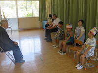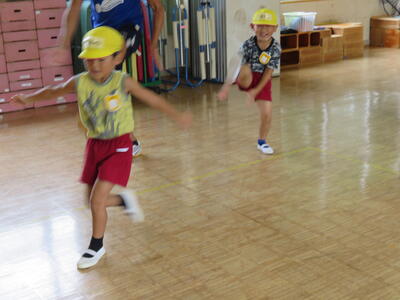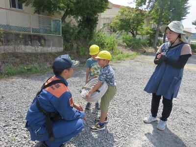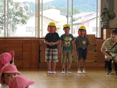 今日は今年度2回目の避難訓練でした。「大きな地震発生の後,火災が発生し,園庭に避難をする」というものでした。「先生の指示をきちんと聞き,落ち着いて行動できるか」,「話をよく聞いて防災への意識を高める」の2点が大きなねらいでもありました。川合先生の避難合図を静かに聞き,川名先生の誘導で避難開始です。おしゃべりをすることもなく,ハンカチを口にあて,素早く非難をすることができました。真剣な表情で非難をする姿は素晴らしかったです。消防署の方から「何か異変があったら,大人の人に知らせることが大事です」と教えていただきました。