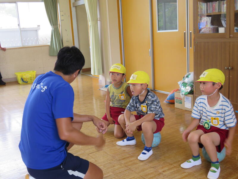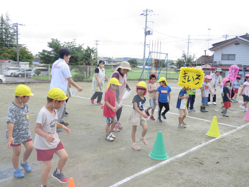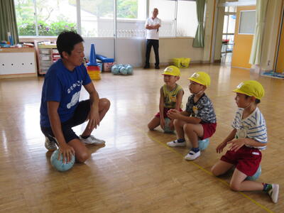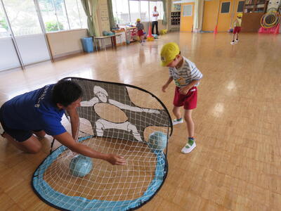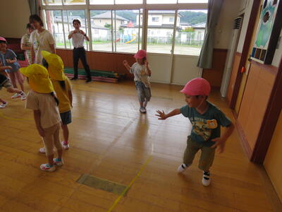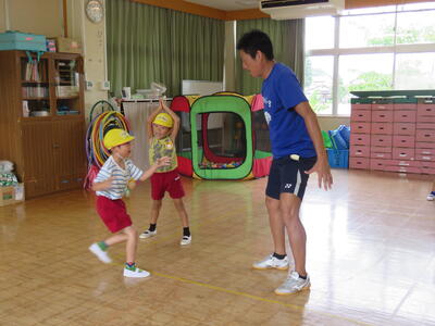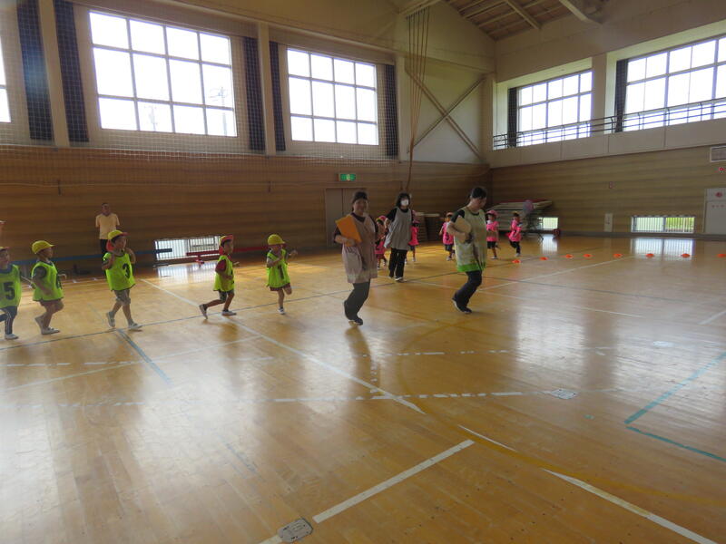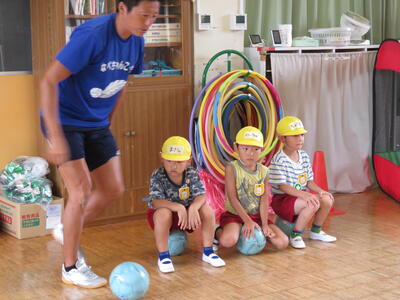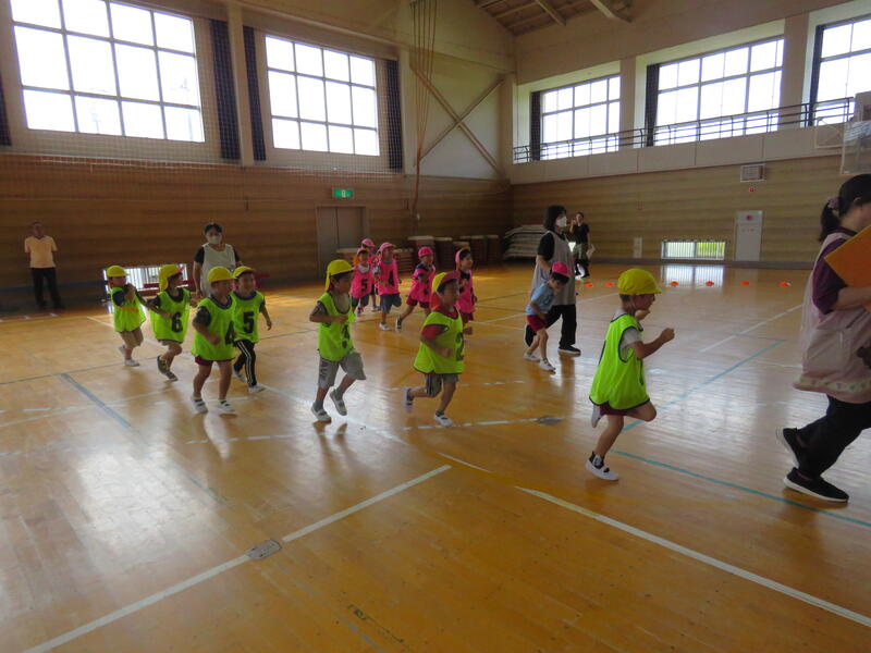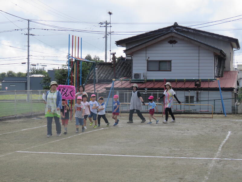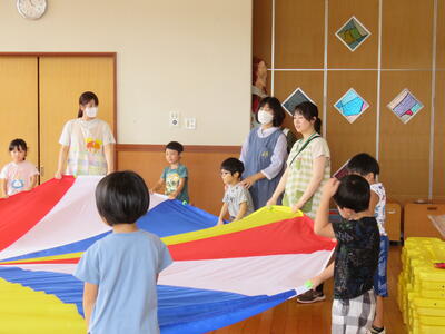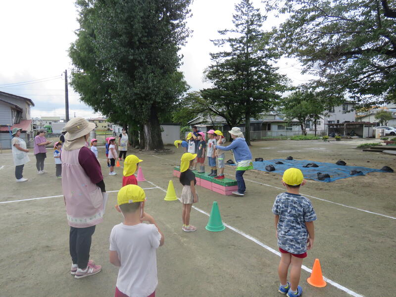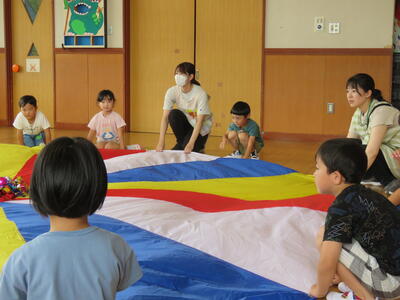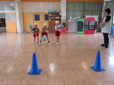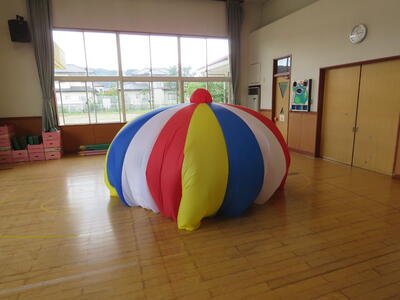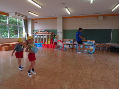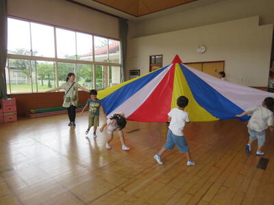 今日は,渡利幼稚園で交流活動でした。2名のお友だちがお休みで寂しかったのですが,2人で行ってきました。顔見知りのお友だちも増え,スムーズにとけ込みながら,自由遊びを楽しんだり,大きなバルーンで遊んだりしました。2人の成長を感じながら様子を見守っていました。次の渡利幼稚園との交流は11月の予定です。さらに成長した姿が見られるだろうと今から楽しみです。