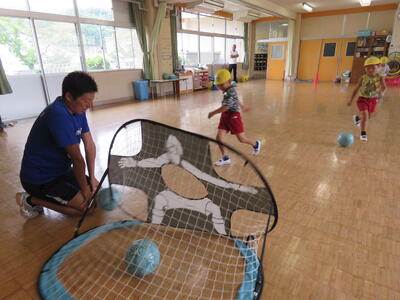 今日はキッズサッカーでした。コーチは1学期に来ていただいた落合堂コーチ(オチコーチ)に替わって渡辺コーチ(なべちゃんコーチ)でした。1学期と同様子どもたちはすっかりサッカーマンに変身していました。姿勢や話の聞き方など,人として大事なことを教えていただきながら,シュートをしたりゲームをしたりと,サッカーの楽しさを感じていました。終わりのころは,まだまだやりたい気持ちが強いようで,終わってしまうのが残念な様子でした。なべちゃんコーチに感謝の一日でした。