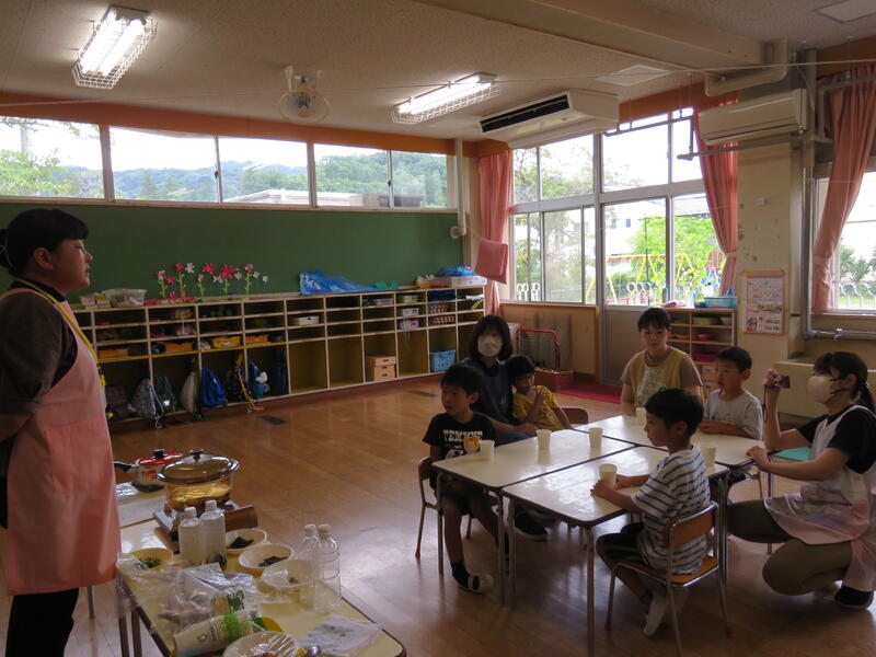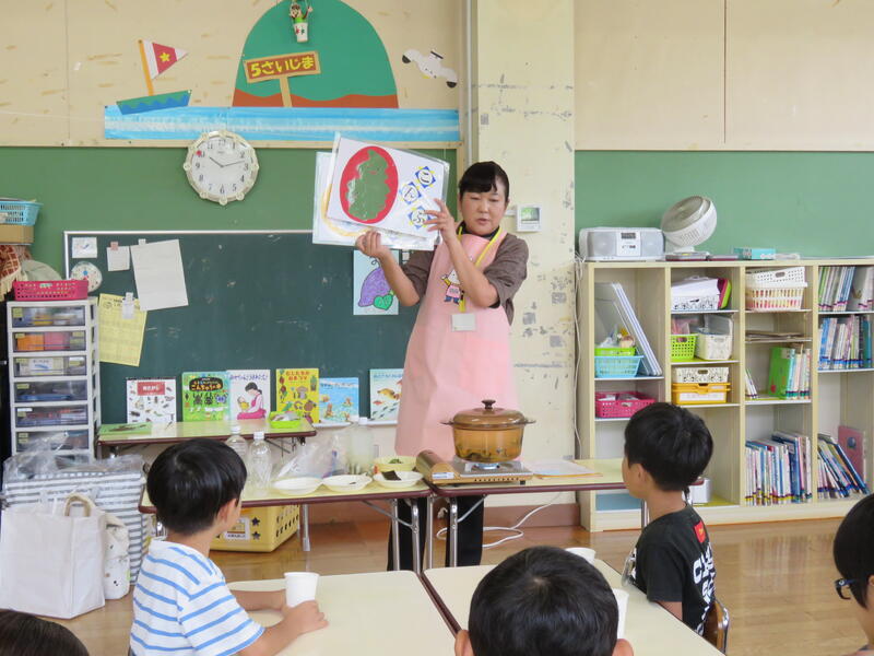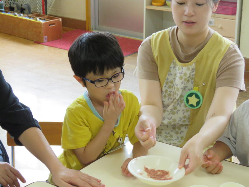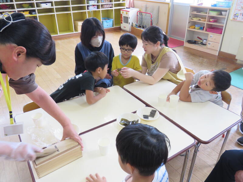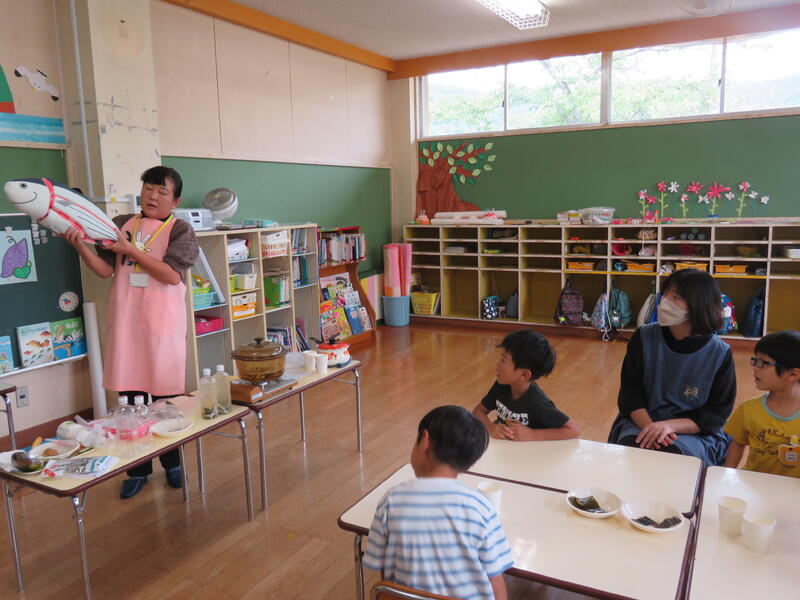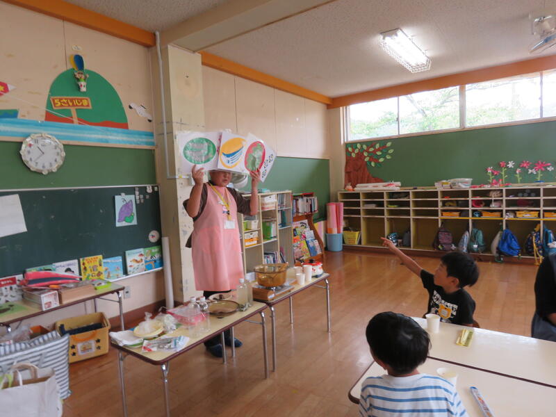 昨日は「食育」活動の一環として,幼稚園・保育課の管理栄養士山田先生をお迎えして,「みそ汁のひみつ」をテーマに活動をしました。目標は,【1 だし汁の存在を知ること 2 食材(煮干しやかつお節)の食感,みそ汁のにおいやうまみを体験する】 ことでした。